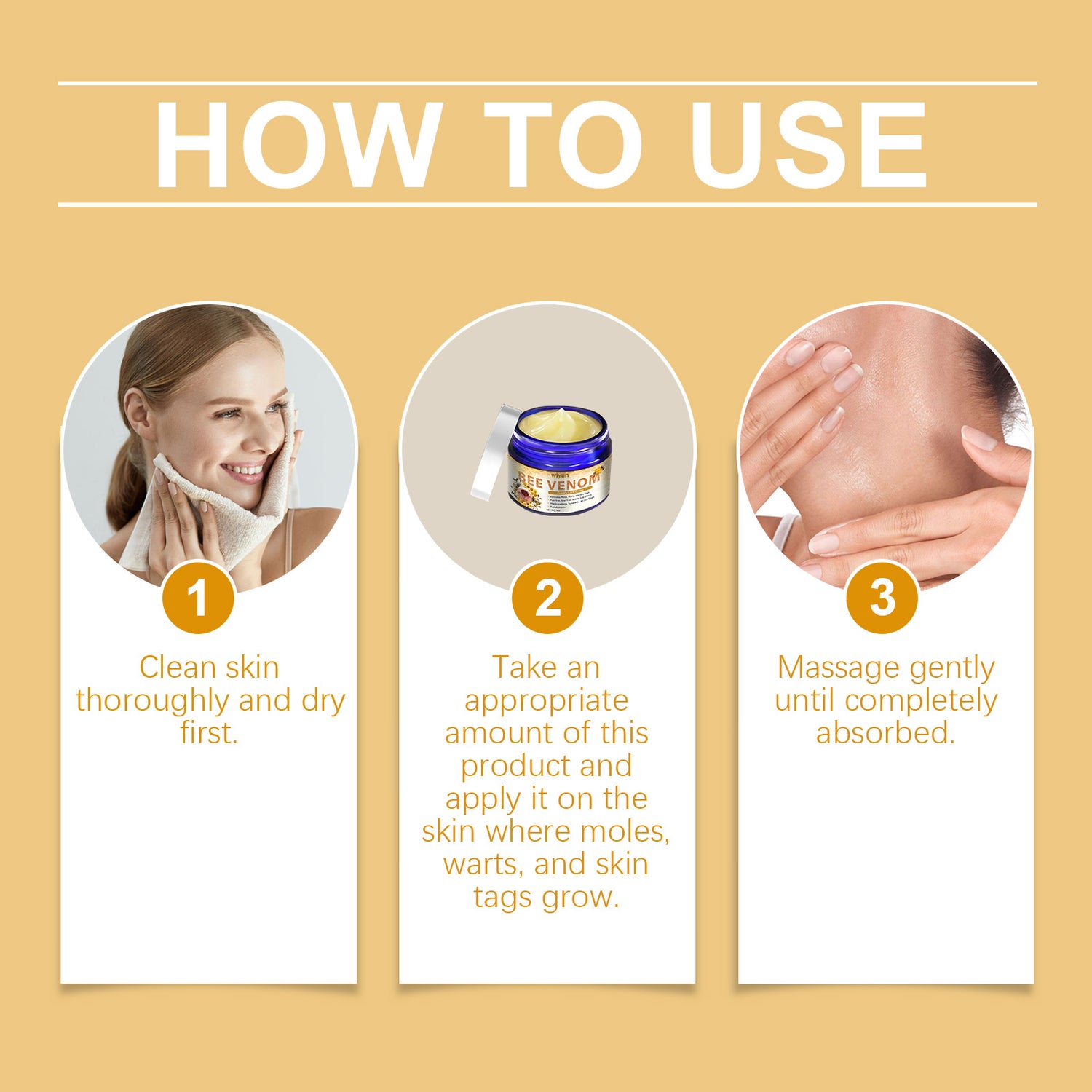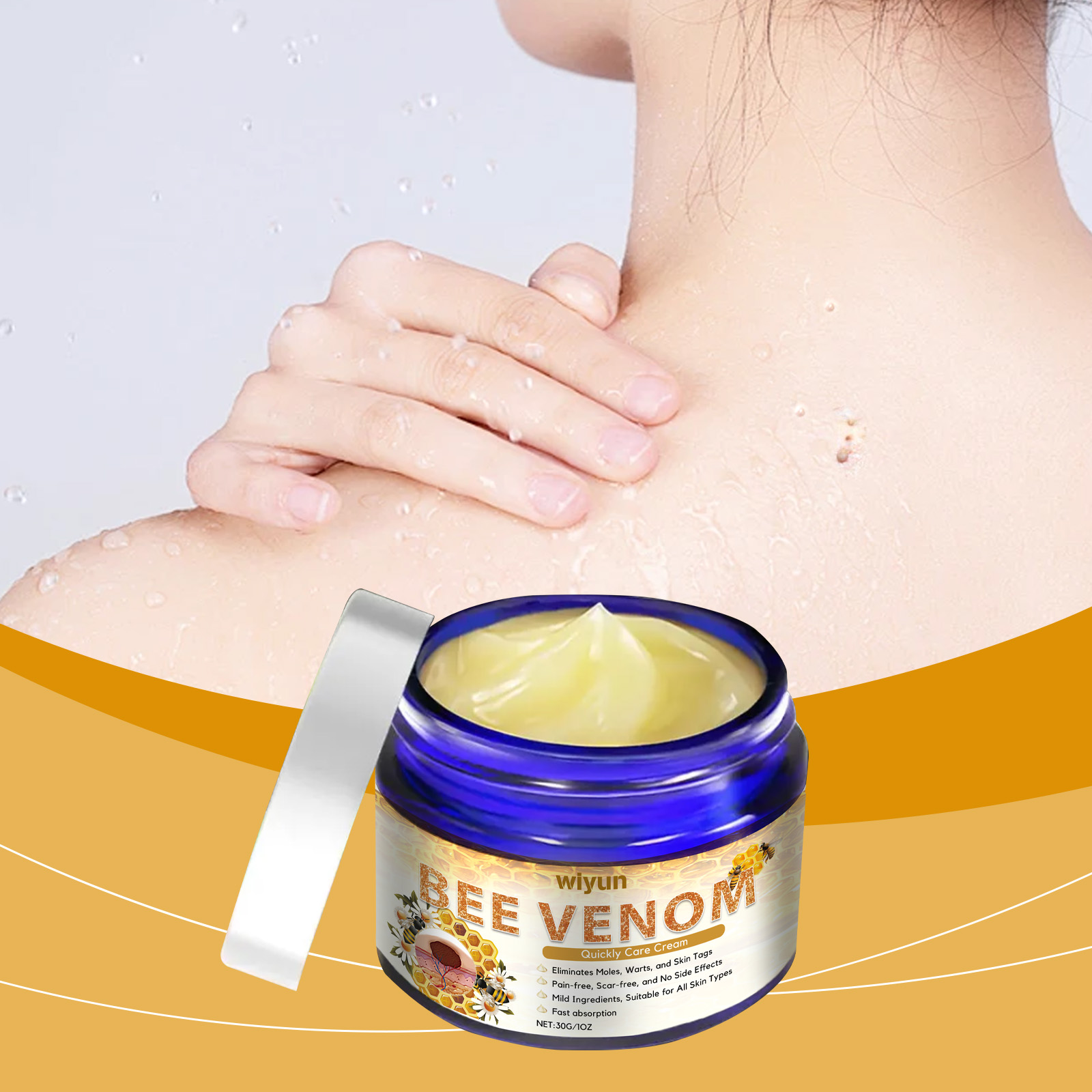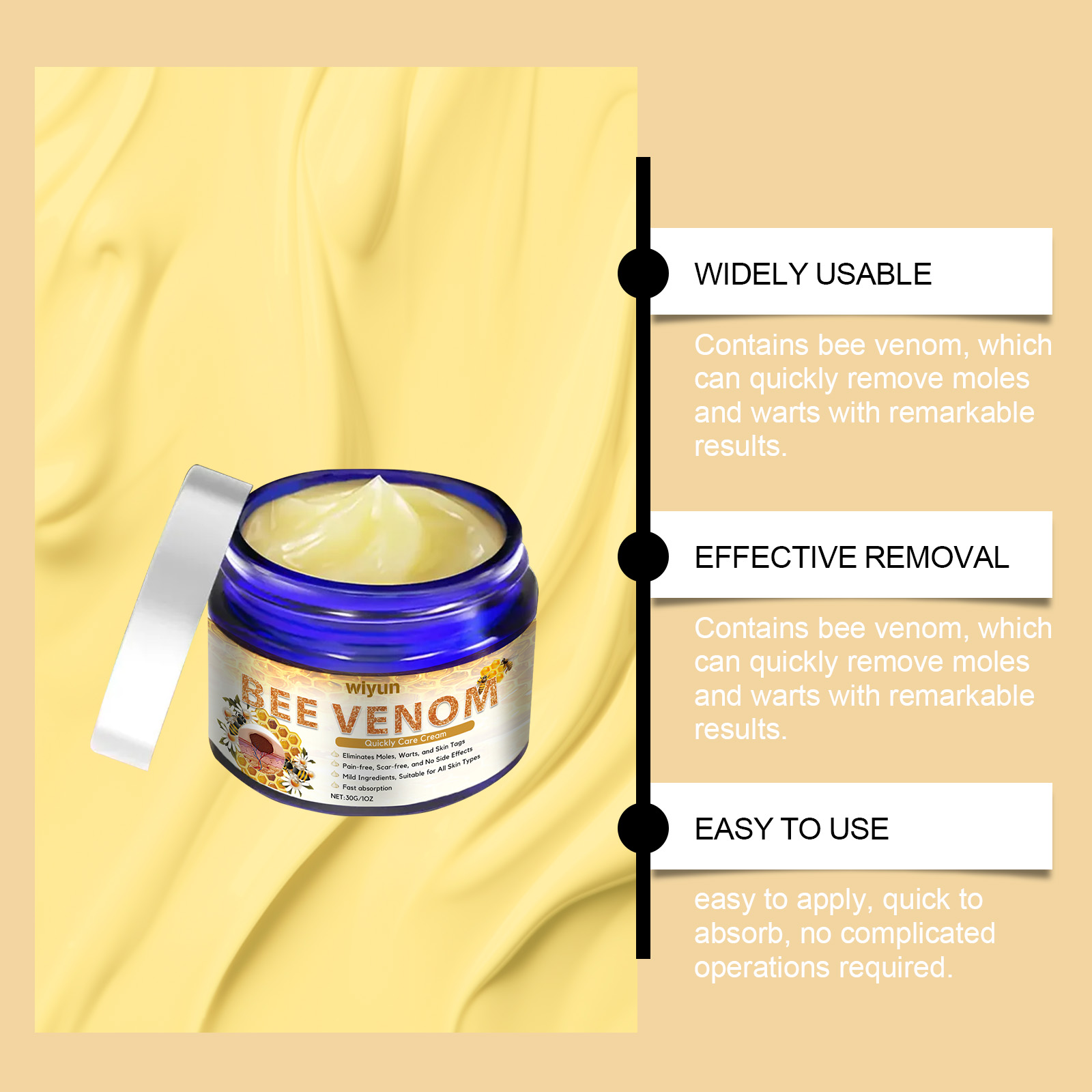 Our bee venom skin care cream contains bee venom and coconut oil. It contains bee venom, fast removal of moles and warts, effective, herbal, mild and non-irritating, suitable for all skin types. Its application is simple: thoroughly clean the skin and dry it first. Apply appropriate amount of this product to the skin of moles, warts and skin marks. Massage gently until fully absorbed. And can painlessly remove skin warts and moles, and quickly restore smooth skin.