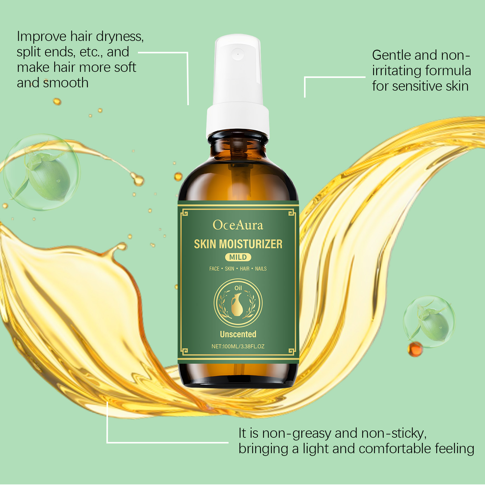 Our body moisturizing oils contain glycerin, olive oil, aloe vera extract. It can deeply moisturize the skin, shrink pores, enhance skin elasticity, and make skin firmer and more delicate. And improve skin softness and smoothness. Its use is very simple: 1. Usage: After cleaning and drying the hair, apply appropriate amount of this product on the hair, gently massage until absorbed. 2. Skin use: Clean and dry the skin, apply appropriate amount of the product evenly on the face and body, gently massage until absorbed. 3. Nails: Clean and dry hands, apply appropriate amount of this product around the nails, gently massage until absorbed. Olive oil provides rich nutrients for the skin and hair, repairs damaged hair and scalp, helps improve dry and fragile hair and restores a healthy glow.