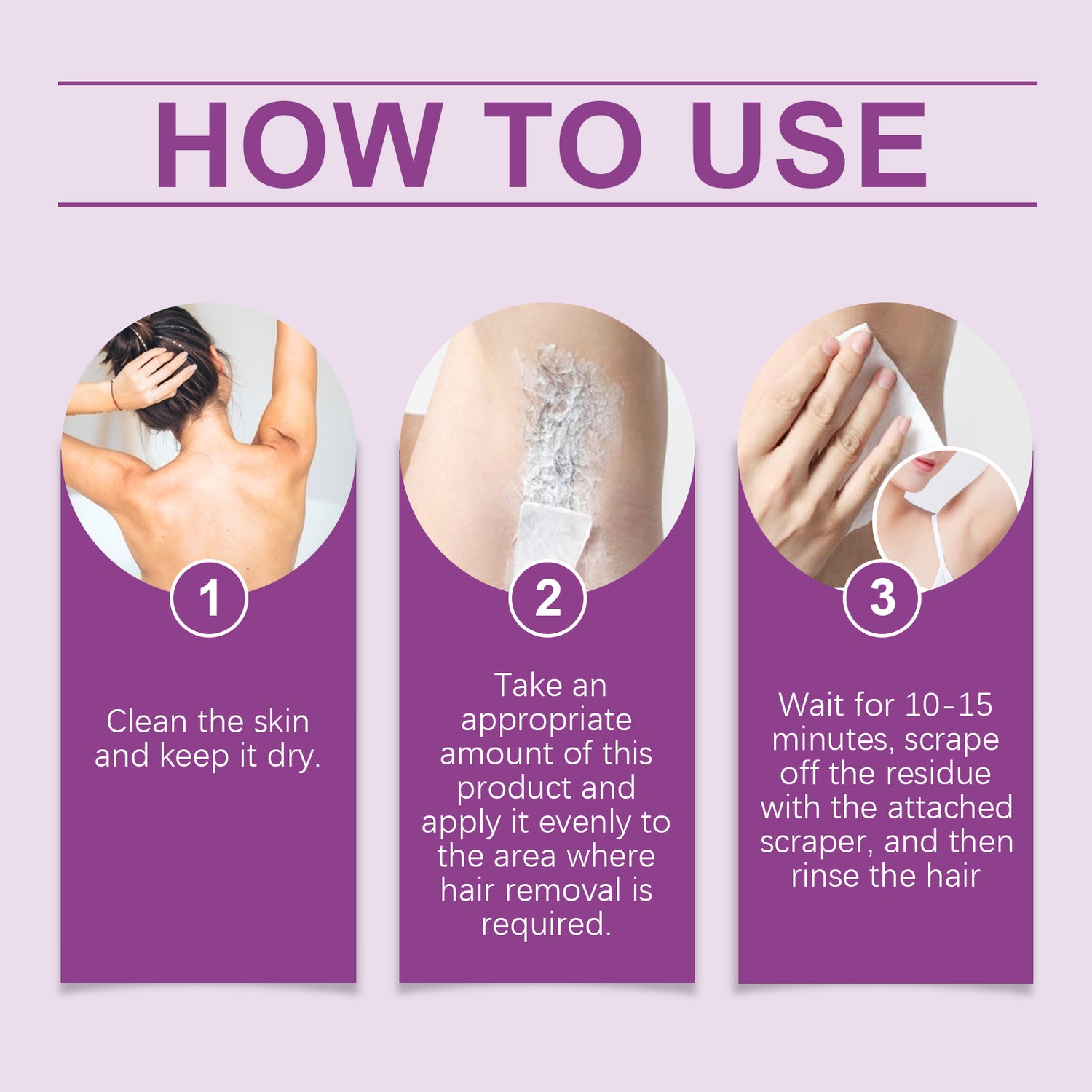 Our body hair removal cream contains glycerin and Asiaticum extract. It can promote skin health and strengthen skin texture. Its application is simple: clean the skin, keep it dry, apply an appropriate amount of this product evenly to the area that needs to be removed, wait 10-15 minutes to remove the residue with the included scraper, and then rinse the hair. And can reduce irritation, suitable for sensitive skin.
