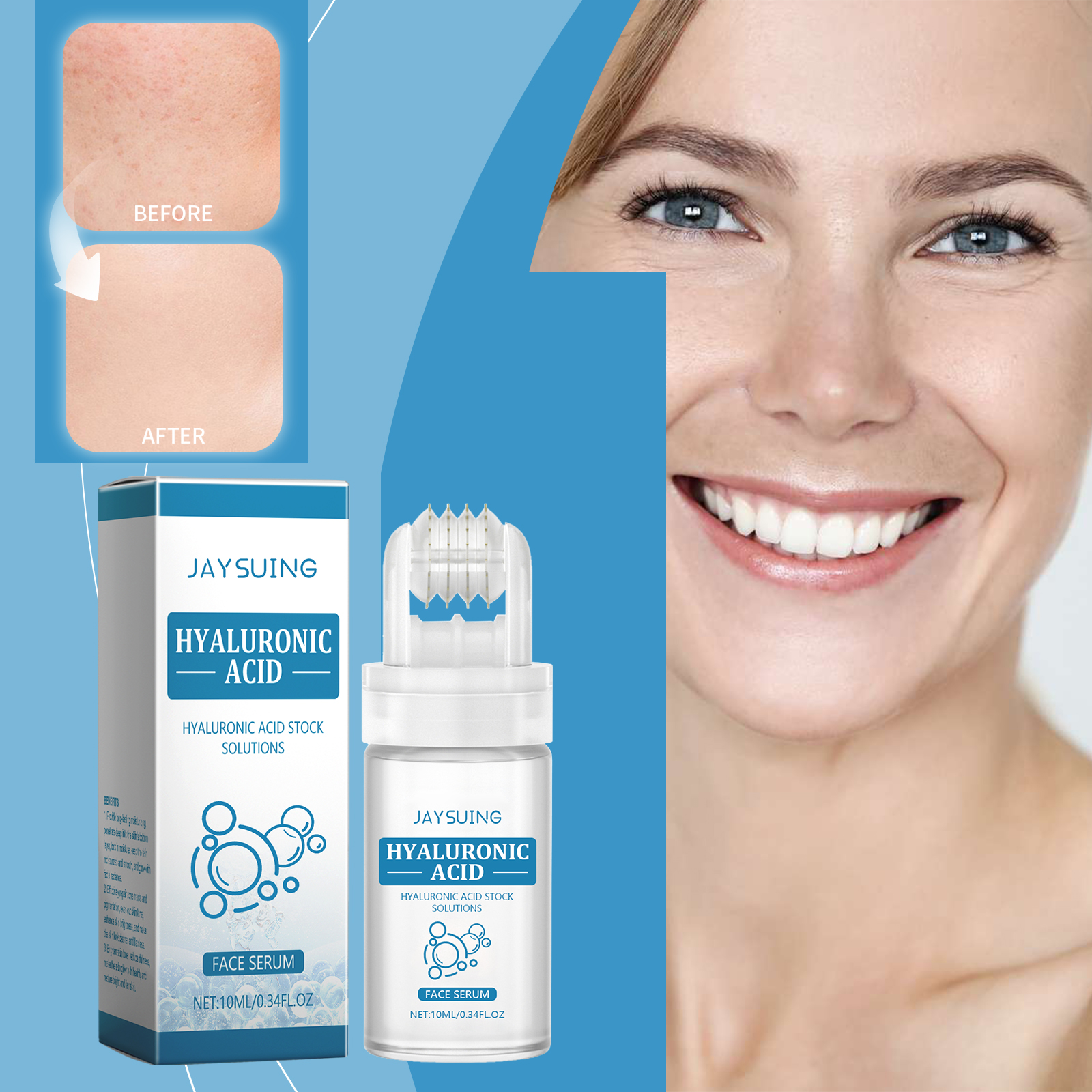 Our hyaluronic acid roller serum contains glycerin, hydroxyethyl cellulose. It quickly penetrates into the skin, providing long-lasting moisture and helping to restore softness and smoothness. Its use method is very simple: clean the facial skin, keep dry, open the bottle cap of the hyaluronic acid serum, install the 64-needle roller head above the serum bottle, roll the roller evenly on the skin surface, and evenly apply the microneedles on the facial skin, each use lasts 15-20 minutes. It can quickly replenish water, lock water, fade acne marks, even skin tone, improve skin elasticity, and tighten skin.