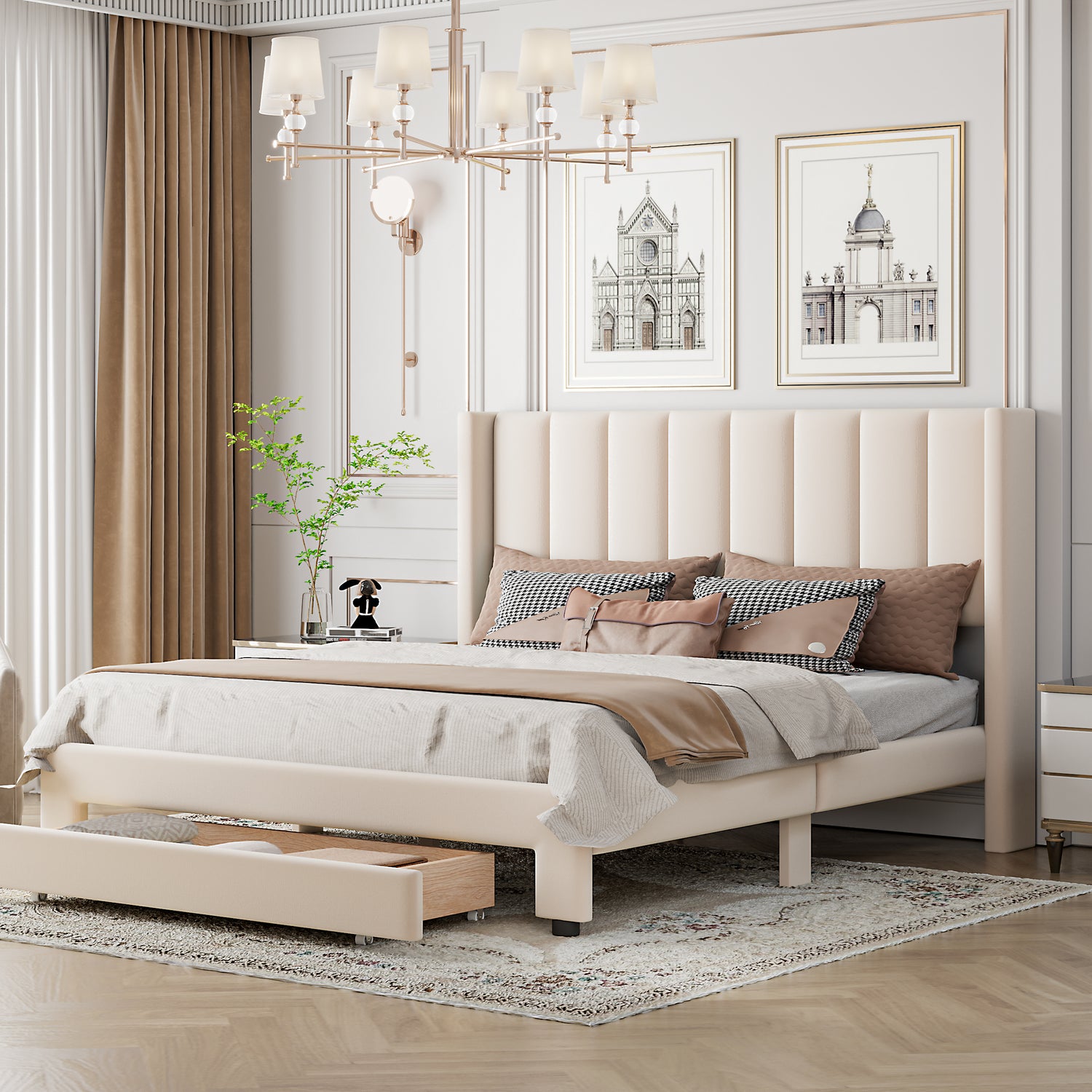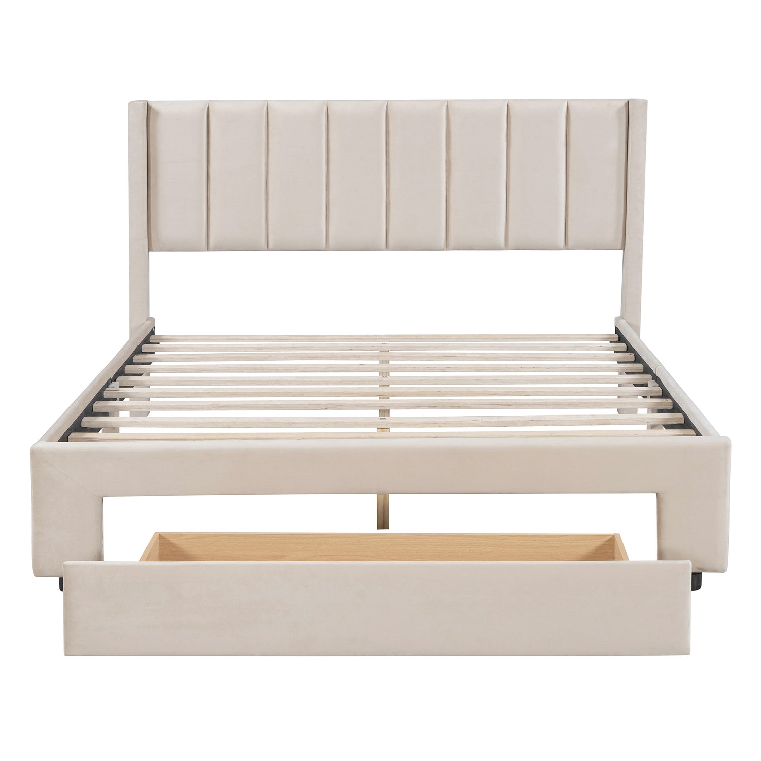 Queen Size Storage Bed Velvet Upholstered Platform Bed with a Big Drawer - Beige