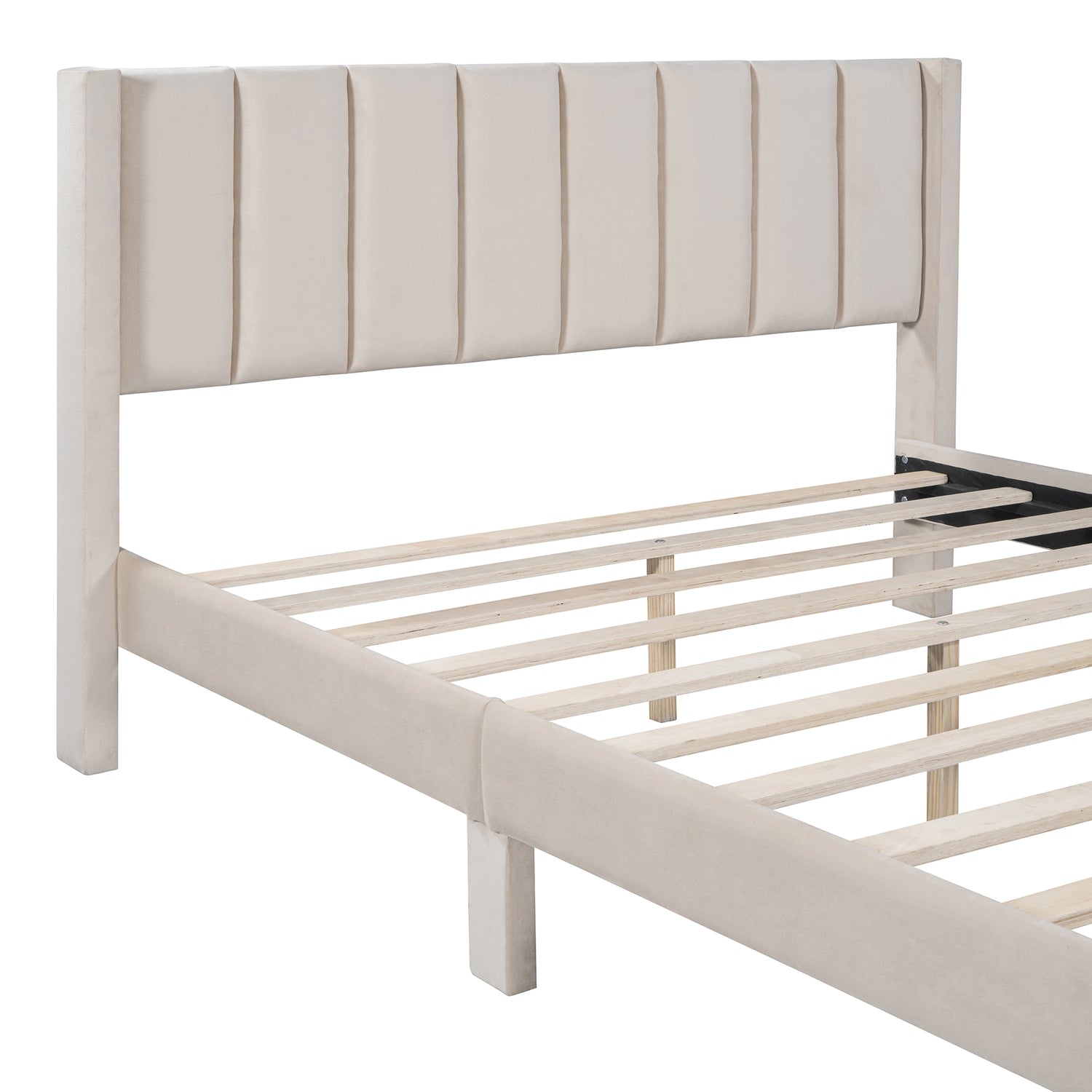 [Elegant Design] Upholstered in carefully-selected velvet fabric, in elegant beige, and with docorative details, this platform bed not only suits any home décor, but is timeless in its design. The soft textile bedhead creates coziness, while the single color of the design creates versatility.
