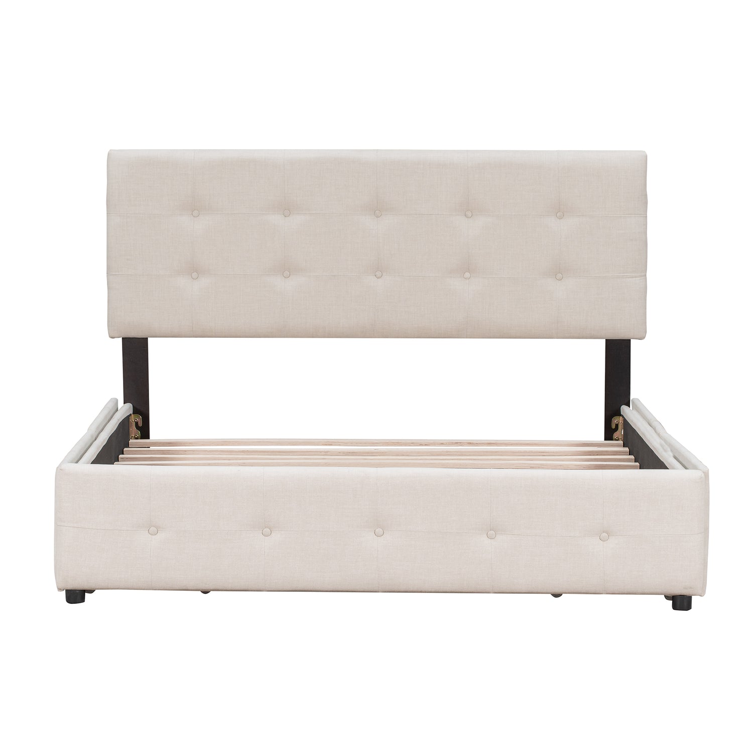 Upholstered Platform Bed with Classic Headboard and 4 Drawers No Box Spring Needed Linen Fabric Queen Size Beige - V.I.P Digital Presence