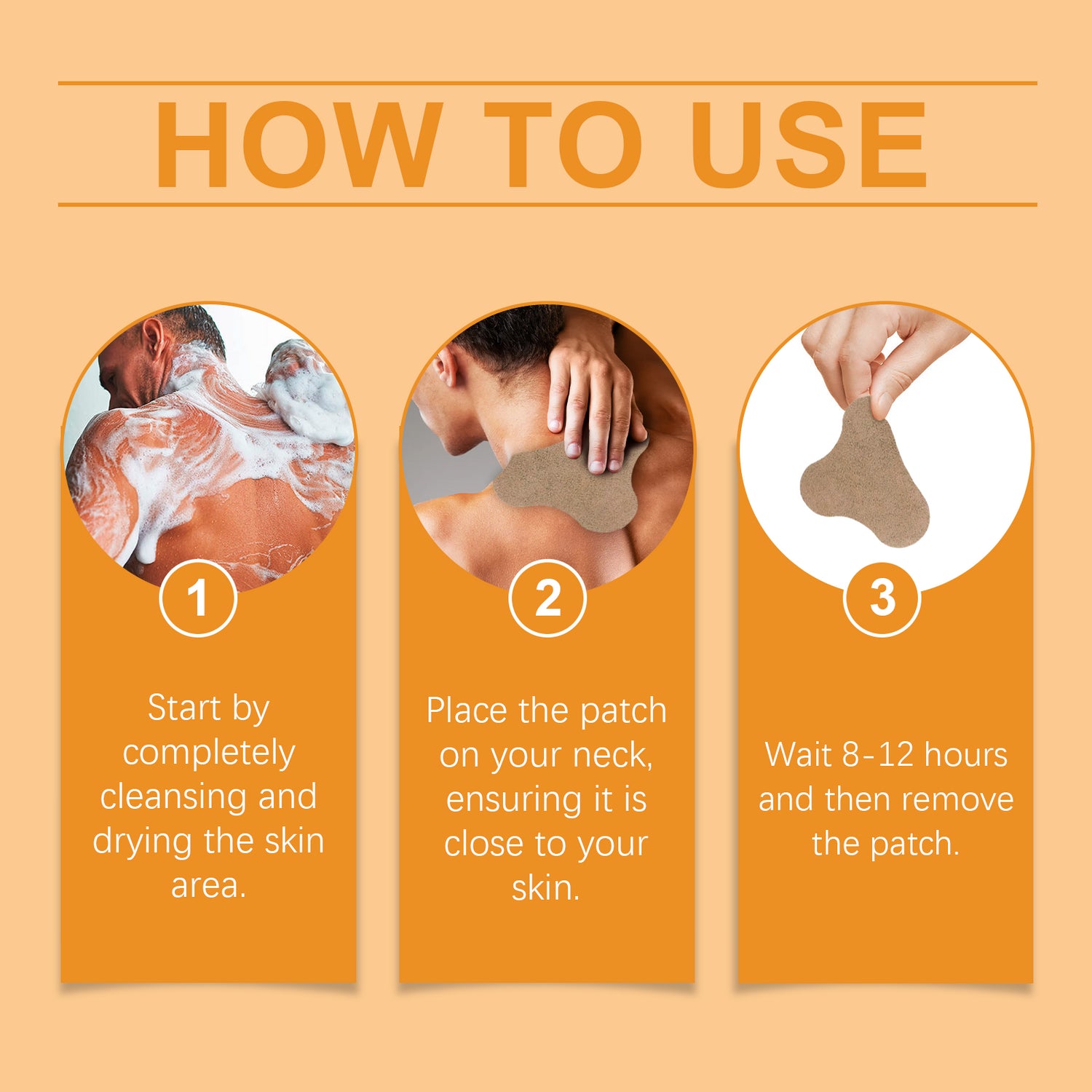 Our cervical pain relief patch contains Angelica root oil and osmanthus flower oil. It can penetrate quickly and relieve cervical and shoulder pain. Improves blood circulation, reduces inflammation and swelling, and promotes healing. Its application is simple: first thoroughly clean and dry the skin area. Place the patch on your neck, making sure it's tight to your skin. Wait 8-12 hours and then remove the patch. 'And can effectively relax tense muscles to reduce fatigue and discomfort.