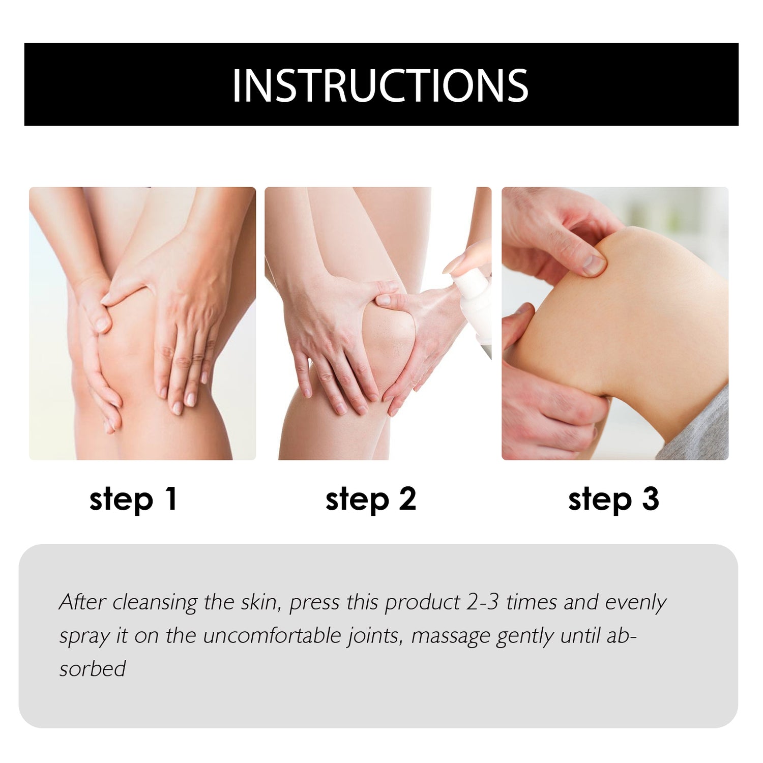 Our Joints & Bone Repair Spray contains ginseng, peppermint extract and Arnica flower extract. It can relieve joint pain, dissolve accumulated joint fluid, relieve swelling, and reduce inflammation. Its use method is very simple: after cleansing, press the product 2-3 times, evenly spray on the uncomfortable joint, gently massage until absorbed. Reduces joint pain, stiffness and inflammation.