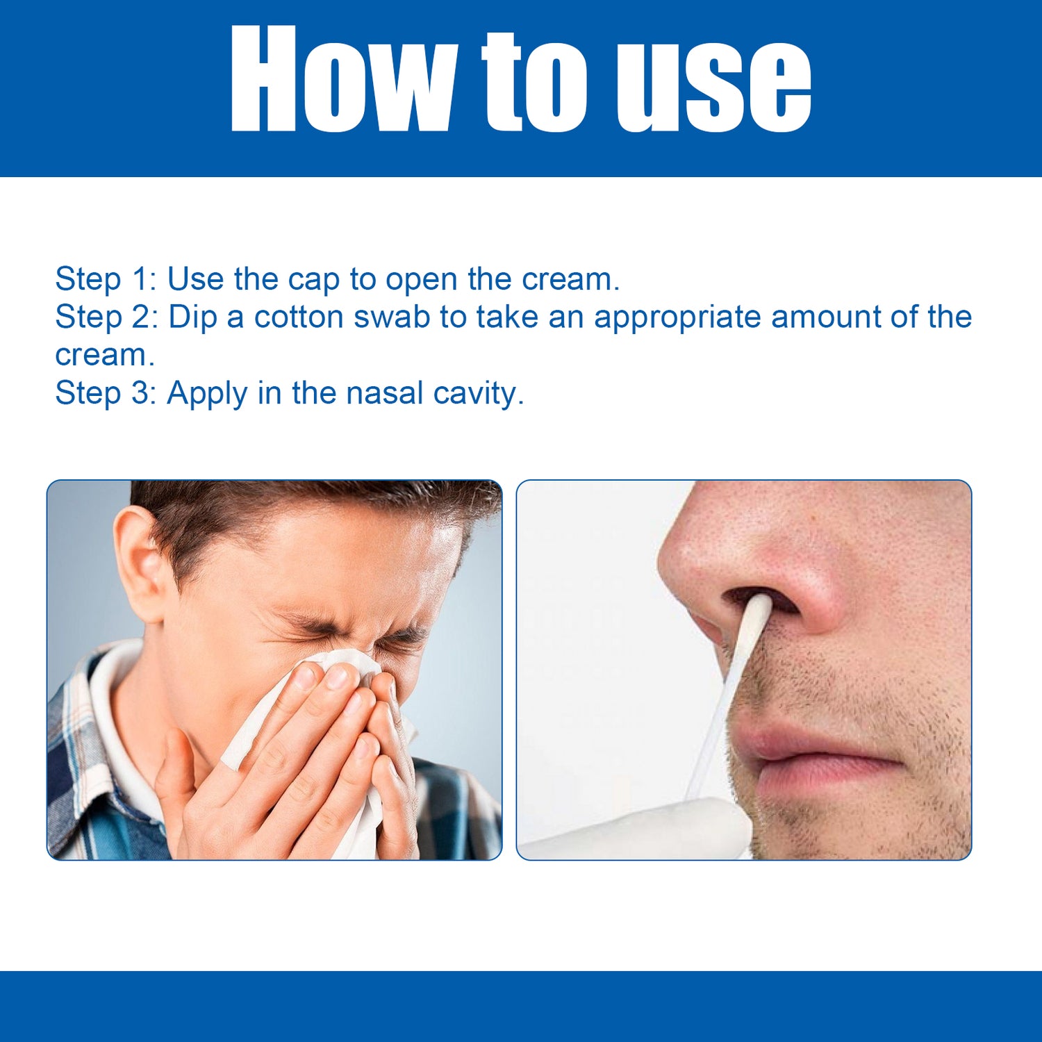 Our nose care cream contains wood magnolia, Angelica and Xanthium. It cleans trachea and lung remnants, repairs your alveoli, and relieves nasal allergy symptoms. How to use it is simple: 1. Open the cream with a bottle cap. 2. Dip a cotton swab into the appropriate amount of semen. 3. Apply to nasal cavity. And can open the breathing passages to improve the respiratory system.