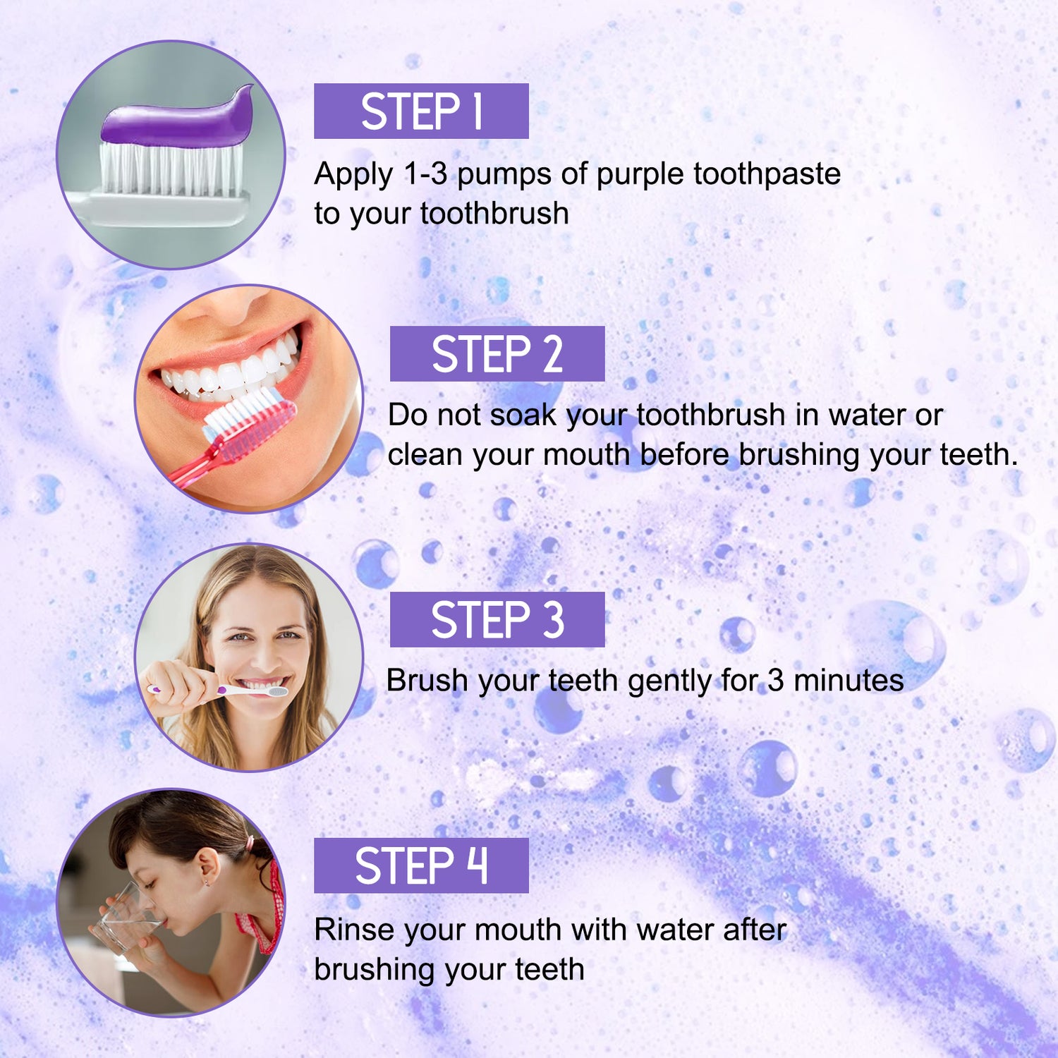 Our Purple Tooth whitening toothpaste contains peppermint extract, xylitol, glycerin. It can reduce yellow discoloration or stains, return teeth to bright white, cleaning ingredients penetrate between teeth, remove food particles and deep stains, and leave no residue to help clean teeth. Its use is simple: apply 1-3 pumps of purple toothpaste to a toothbrush, and do not soak the toothbrush in water or clean your mouth before brushing. Brush your teeth gently for 3 minutes and rinse your mouth with water after brushing. Lighten teeth, remove odor, produce clean, fresh breath, prevent tooth decay, clean tooth stains, reduce bad breath.