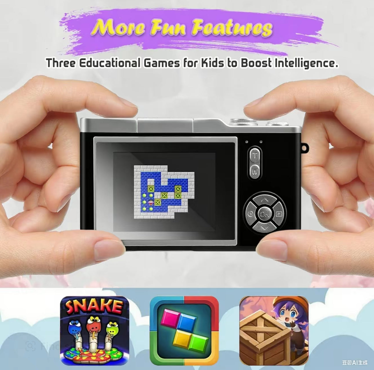 In addition to photo and video capabilities, enjoy built-in games to boost creativity and intelligence. Ideal for fun breaks and entertainment between shots. -