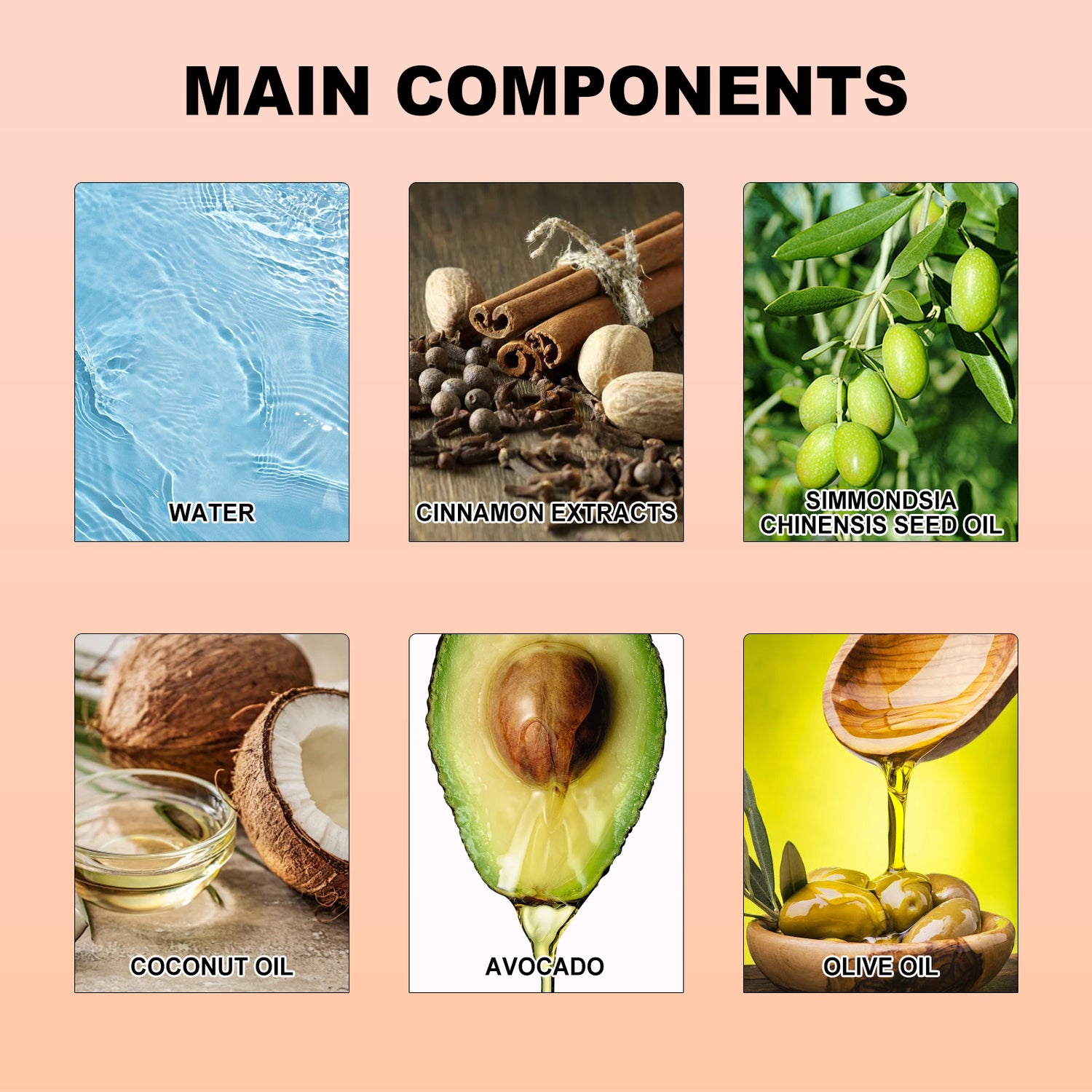 Nuestro aceite corporal artesanal sabor a pan de canela contiene extracto de corteza de Cinnamomum Zeylanicum (canela), aceite de semilla de Simmondsia Chinensis (jojoba) y aceite de Cocos Nucifera (coco). Hidrata profundamente la piel, rehidrata, alivia eficazmente la sequedad, la deja suave e hidratada, aumenta su elasticidad y fortalece su firmeza. Su uso es muy sencillo: limpia y seca la piel, toma una cantidad adecuada y aplícala uniformemente sobre el cuerpo, masajeando suavemente con la palma de la mano hasta su completa absorción. Mejora la piel opaca y le da luminosidad. Contiene diversos extractos de plantas e ingredientes suaves, apto para todo tipo de piel.