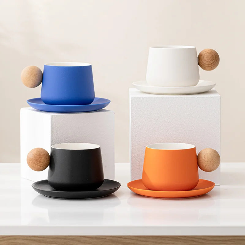 Juego de taza y platillo de café de cerámica, tazas de espresso ligeras de lujo con mango de madera, taza de té de la tarde, tazas originales para mujer, regalos para parejas - Taza naranja / 320 ml está agotado y se enviará tan pronto como vuelva a estar disponible.