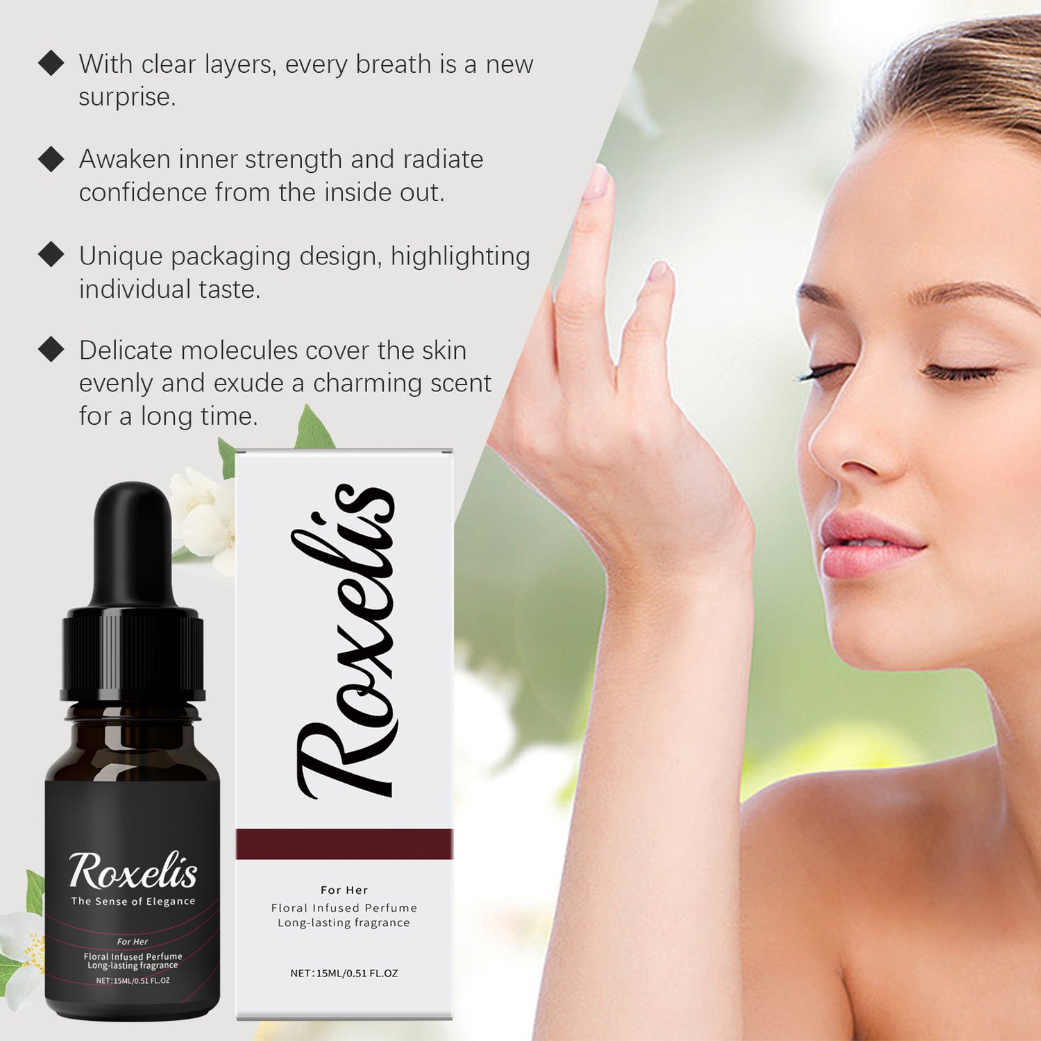 Nuestras gotas florales Charm contienen extracto de flor de jazmín, extracto de capullo de grosella negra y extracto de raíz de peonía. Proporcionan un intenso aroma floral y crean una atmósfera romántica y cálida. Su aroma picante y refrescante aporta una vitalidad única. Añade un toque de elegantes notas florales para equilibrar los aromas. Su modo de uso es sencillo: 1. Aplica una gota de perfume en la parte interior de la muñeca, en la nuca o detrás de la oreja, donde sientas el pulso latiendo con claridad. 2. Masajea suavemente la zona con las yemas de los dedos para distribuir el perfume uniformemente. El aroma a rosas frescas despierta tus sentidos y te trae nuevas experiencias. La fórmula es fresca, ligera, no grasa y agradable al tacto.