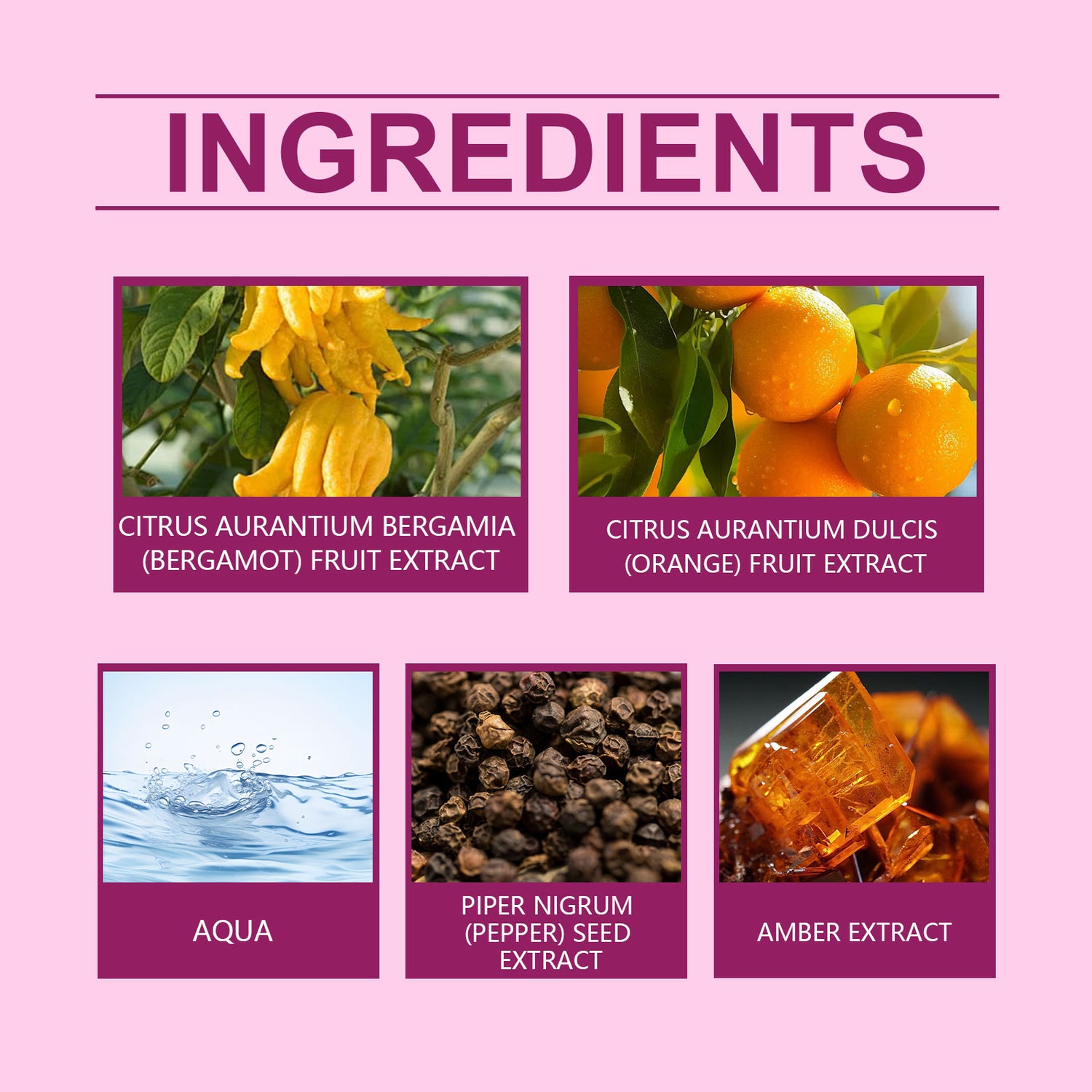 Nuestro perfume Charm Charm (colonia) contiene extracto de semilla de pimienta negra, extracto de ámbar y extracto de bergamota. Aumenta la intensidad de la fragancia, haciéndola más duradera y atractiva. Fresco y refrescante, añade un toque de vitalidad. Aporta un vibrante aroma frutal, haciéndolo más fresco y agradable. Su modo de uso es muy sencillo: rocía el perfume en la muñeca, el cuello, la espalda y otras zonas. También puedes rociarlo en el aire y luego caminar entre la niebla para que se distribuya uniformemente por todo el cuerpo, dejando un aroma intenso. Una colonia rica que irradia encanto personal. Libera tu encanto y añade detalles profundos.