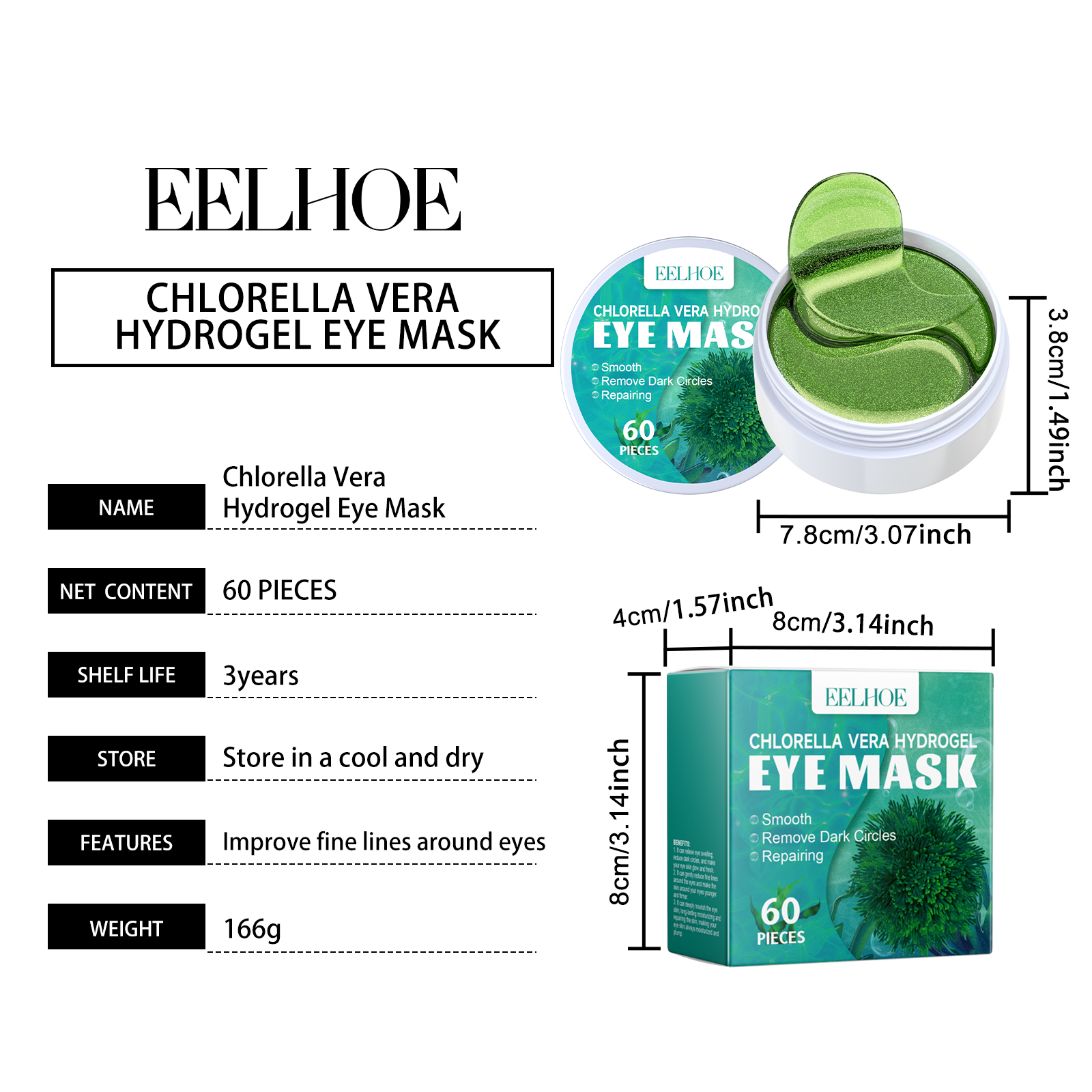 Mascarilla de hidrogel para ojos con clorella vera, hidratante y desalinizante, compacta, de grano fino, suave y para la piel.