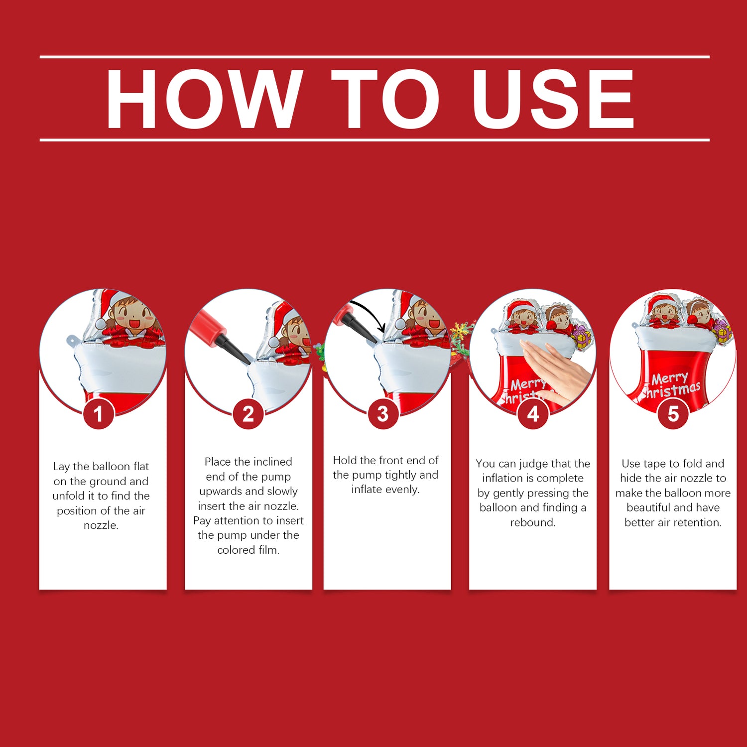 Nuestro globo de árbol de Navidad contiene papel de aluminio de nailon. Este juego de globos está hecho de material de papel de aluminio de nailon, resistente a las perforaciones, se puede inflar durante mucho tiempo para mantener la forma perfecta, no es fácil que gotee, adecuado para uso en interiores y exteriores. Formas navideñas clásicas como Papá Noel, alce, muñeco de nieve, etc. Agregue un ambiente navideño a su hogar o fiesta. Su uso es simple: coloque el bisel en la parte delantera, como pueda juzgar, doble y oculte la boquilla de aire con cinta adhesiva para que el globo sea más hermoso, extiéndalo en el suelo, ábralo y encuentre la ubicación de la boquilla de aire. Tenga cuidado de insertar el cilindro de gas debajo de la película de color. Presione suavemente el cilindro, encuentre la restricción e ínflelo. Mejor retención de aire. Y el material es grueso, autosellante sin fugas. Se puede conservar durante mucho tiempo y puede decorar la casa.