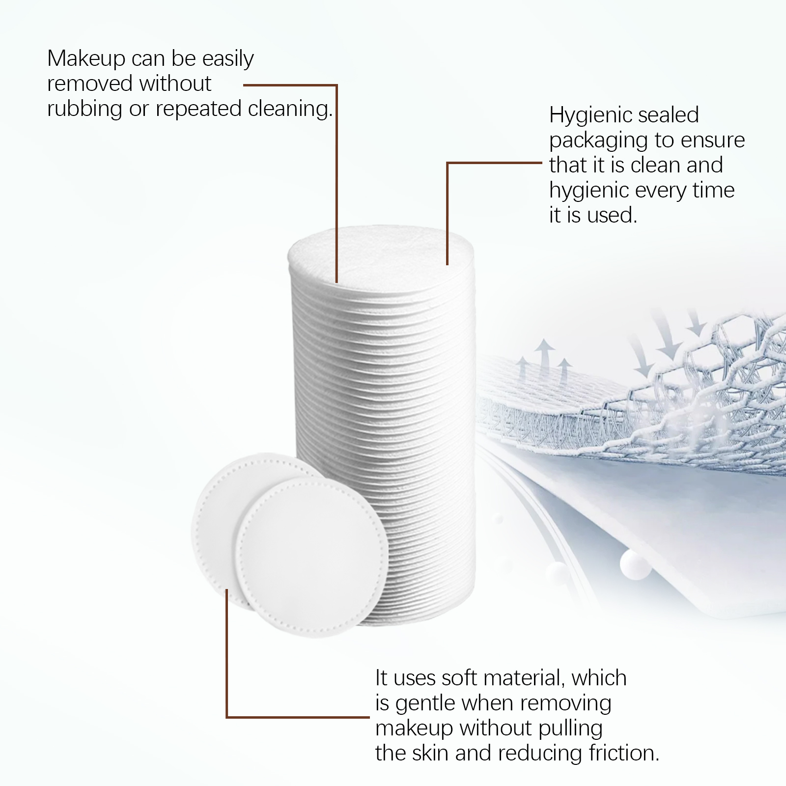 Nuestras almohadillas desmaquillantes faciales están hechas de algodón y telas no tejidas spunlaced. Eliminan fácilmente el maquillaje y la suciedad, son suaves y no irritan la piel. Su uso es muy sencillo: 1. Saque un disco de algodón, vierta el líquido de premaquillaje sobre él y asegúrese de que esté completamente empapado. 2. Extienda suave y uniformemente sobre la piel para disolver el maquillaje. Suave y limpio, inocuo para la piel. Limpieza profunda para eliminar la suciedad y los residuos de cosméticos; suaviza la piel, apto para pieles sensibles.