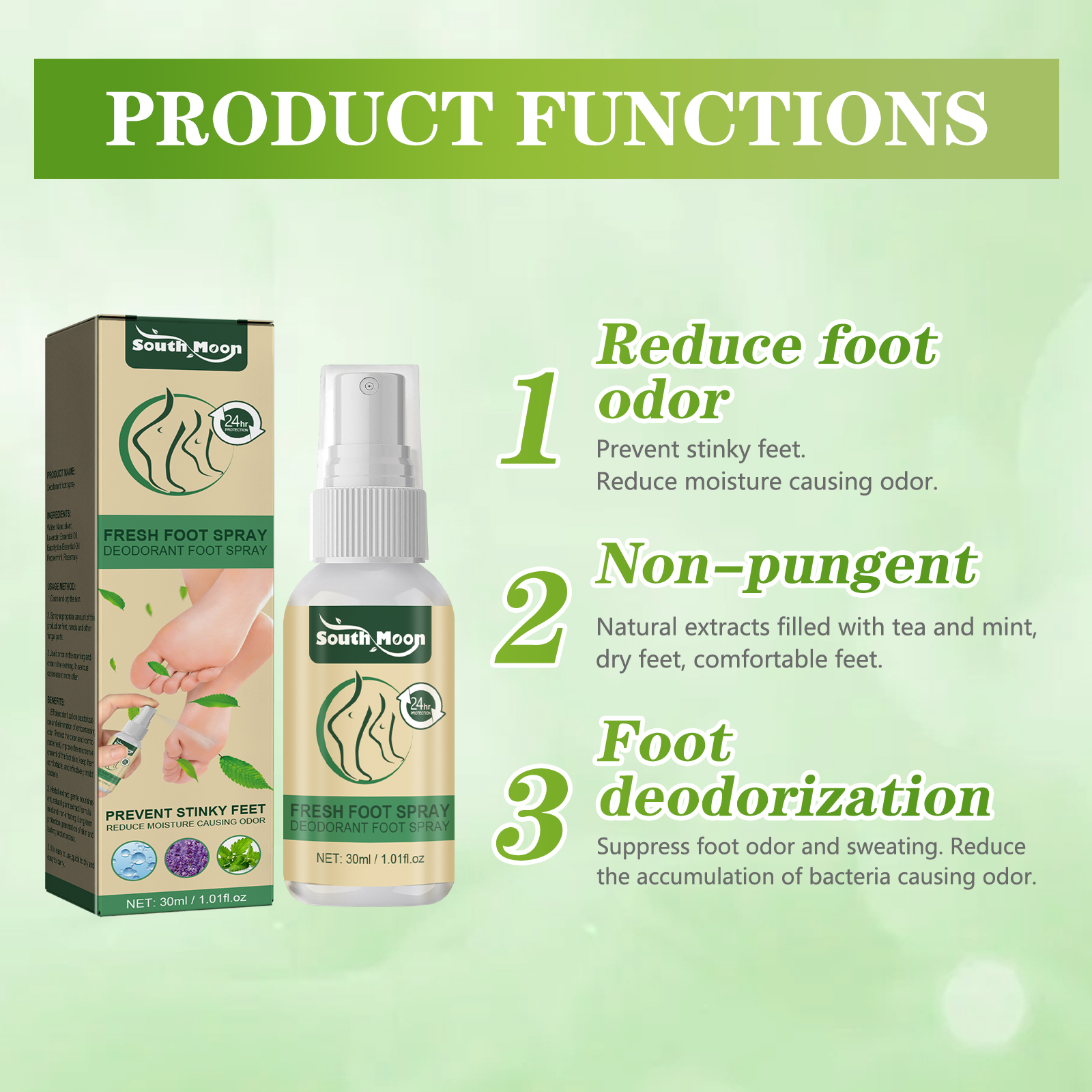 Nuestro desodorante en aerosol para pies contiene nanopartículas de plata, aceite esencial de lavanda y aceite de eucalipto. Reduce el olor de pies, previene el mal olor y reduce el olor causado por la humedad. Contiene esencia natural de té y menta para secar y reconfortar los pies. Reduce el olor y la sudoración de los pies. Reduce la acumulación de bacterias que causan mal olor. Su uso es sencillo: 1. Limpia y seca la piel. 2. Rocía la cantidad adecuada de producto en pies, manos y otras zonas con hongos. 3. Úsalo una vez por la mañana y otra por la noche. En casos graves, úsalo con más frecuencia. Previene el olor de pies y reduce el dolor causado por la humedad. Desprende un aroma suave pero no penetrante.