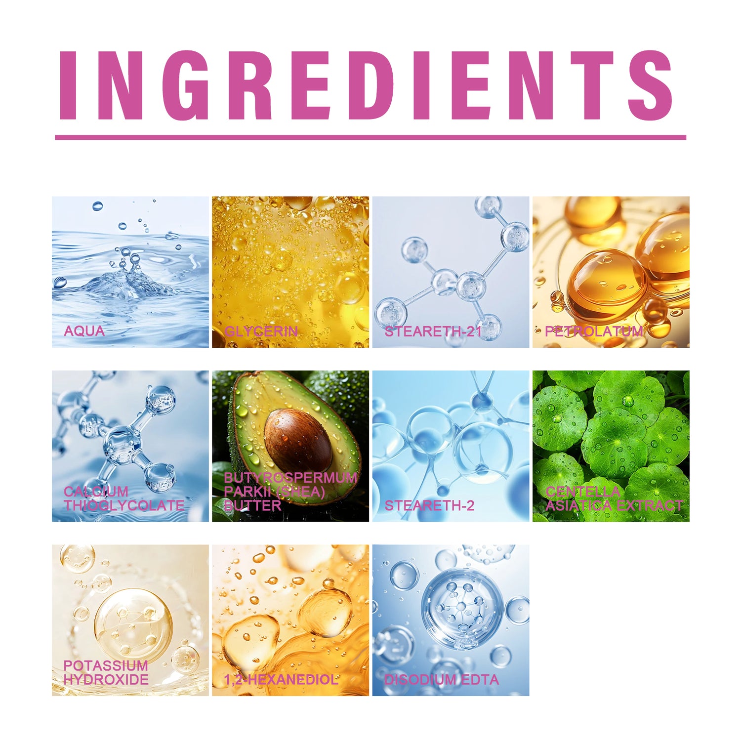 Nuestra crema depilatoria herbal contiene glicerina y estearol-21. Elimina fácilmente el exceso de vello, hidrata la piel, ayuda a mantener su elasticidad y la deja sedosa y suave después de la depilación. Su método de aplicación es muy sencillo: limpia y seca la piel, toma la cantidad adecuada de crema depilatoria, aplícala uniformemente en la zona deseada, déjala actuar de 5 a 10 minutos, usa una espátula para aplicar el vello y, finalmente, enjuaga con agua. Penetra rápidamente en la piel, disuelve el vello y te ayuda a eliminarlo de forma fácil e indolora, gracias a sus ingredientes suaves que no irritan la piel ni dejan manchas oscuras.