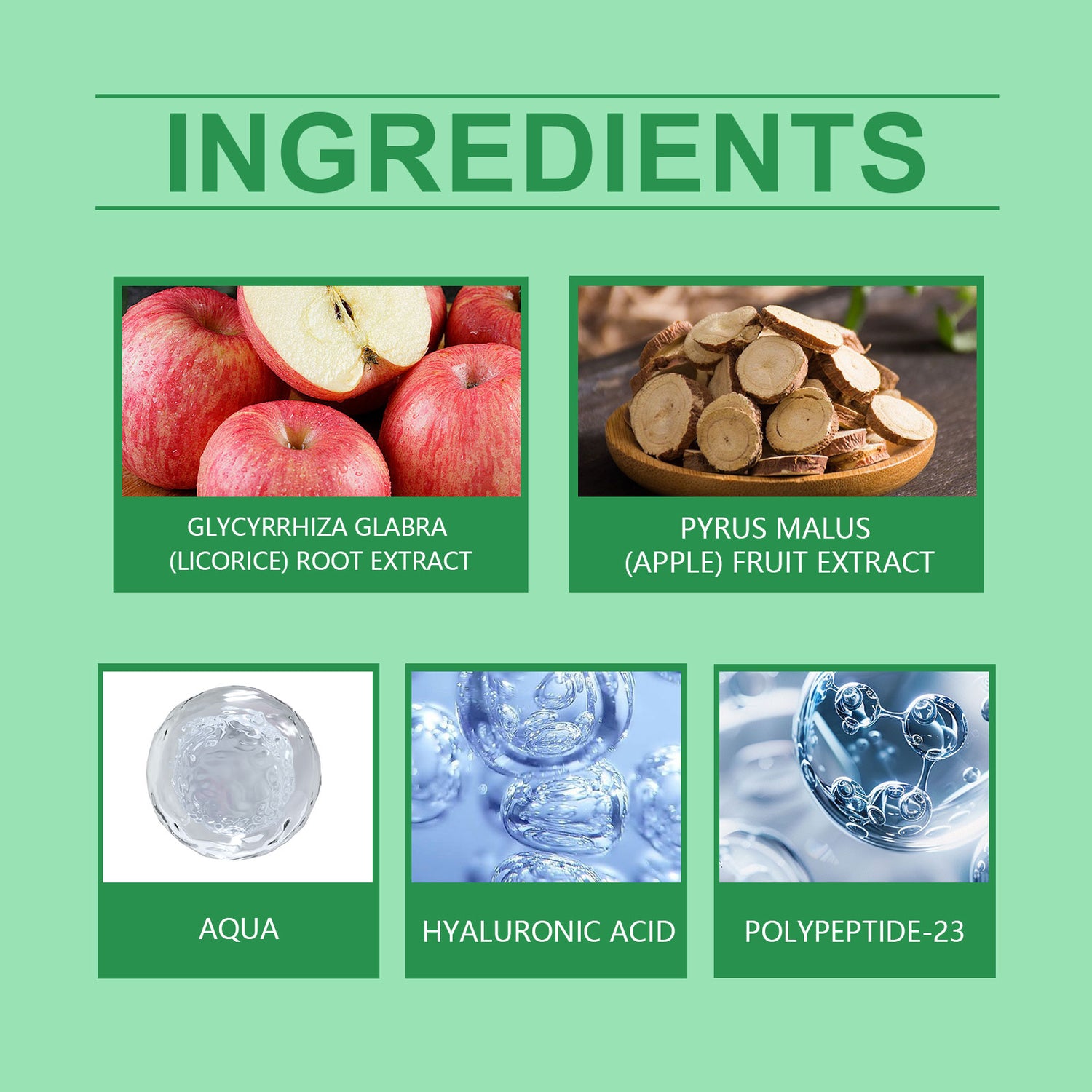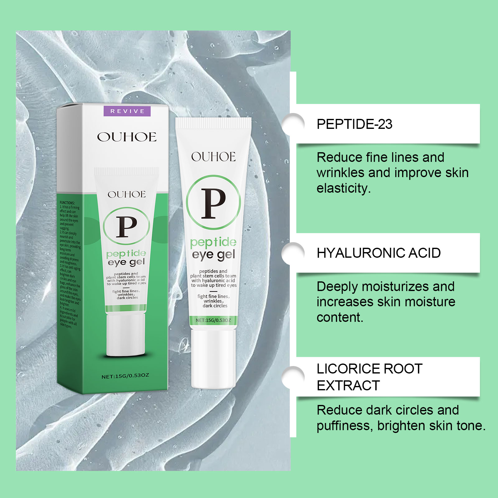 Nuestro gel de proteína peptídica para ojos contiene extracto de raíz de regaliz y extracto de manzana. Atenúa la opacidad del contorno de ojos, aclara el tono de la piel y restaura la luminosidad y el atractivo de la mirada. Su aplicación es muy sencilla: limpia y seca bien la piel del rostro y del contorno de ojos, aplica una cucharada del producto en el contorno de ojos y masajea suavemente hasta su completa absorción. También suaviza las líneas de expresión del contorno de ojos y deja la piel más suave y delicada.