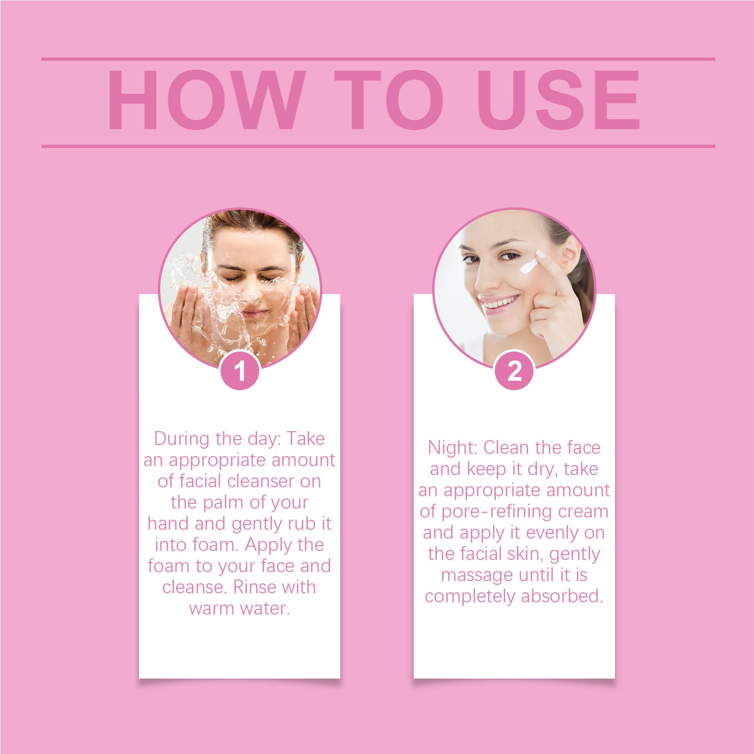Nuestro Set de Esencias para Refinar Poros contiene Gel Limpiador con Ácido Azelaico: Ácido Azelaico, Ácido Hialurónico, Extracto de Hoja de Camellia Sinensis, Crema para Refinar Poros con Ácido Salicílico: Ácido Salicílico, Ácido Hialurónico, Extracto de Hoja de Aloe Barbadensis. Proporciona una hidratación profunda, mejora la elasticidad de la piel y la protege del daño de los radicales libres. Su método de uso es muy sencillo: durante el día, tome una cantidad adecuada de limpiador facial en la palma de la mano y amásela suavemente hasta formar espuma. Aplique la espuma sobre el rostro y limpie. Enjuague con agua tibia. Por la noche, limpie el rostro y manténgalo seco. Aplique la cantidad adecuada de crema para suavizar poros uniformemente sobre la piel del rostro y masajee suavemente hasta su completa absorción. Mejora el brillo de la piel y le da un aspecto más saludable. Con el uso prolongado, el estado de la piel mejorará significativamente.