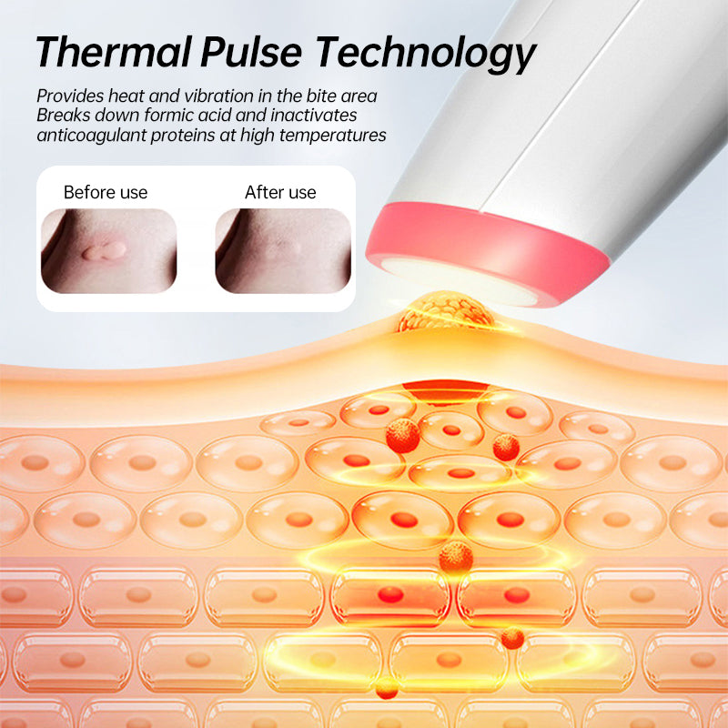 - Tecnología avanzada**: emplea tecnología de pulso de calor, calentando la piel durante 30 segundos, utilizando calor y vibración para alterar las proteínas inyectadas por los insectos y aliviar la inflamación.