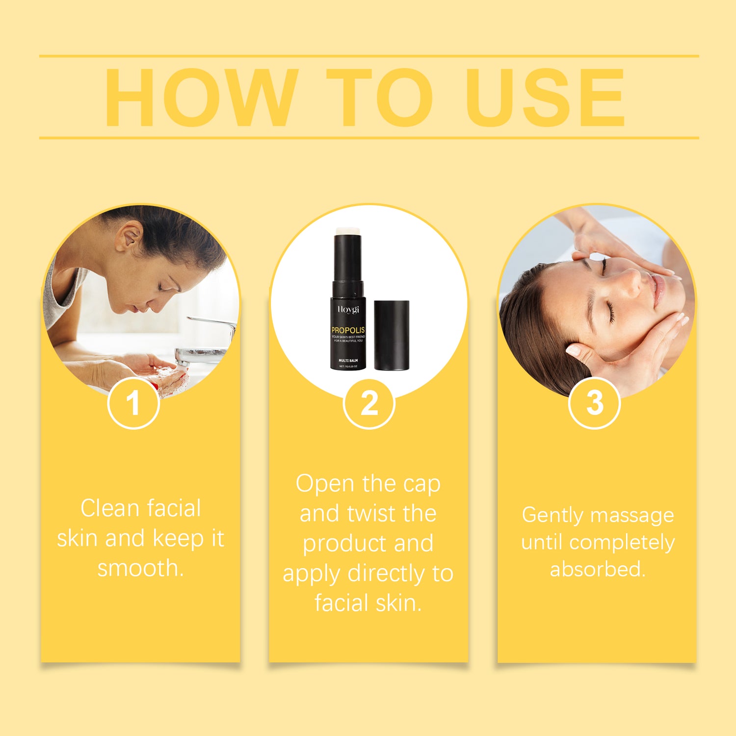 Nuestras barras hidratantes de propóleo contienen aceite de argán y tocoferol. Proporcionan una nutrición duradera para la piel. Su aplicación es sencilla: limpie la piel del rostro para mantenerla suave, abra la tapa, coloque el producto, aplíquelo directamente sobre la piel y masajee suavemente hasta su completa absorción. También ayuda a reducir las líneas de expresión y las arrugas.