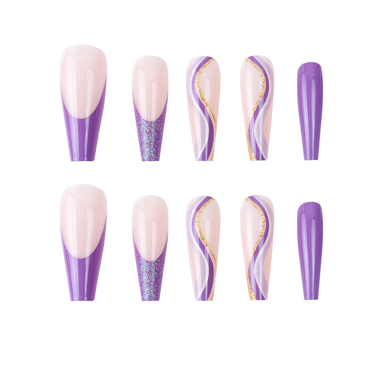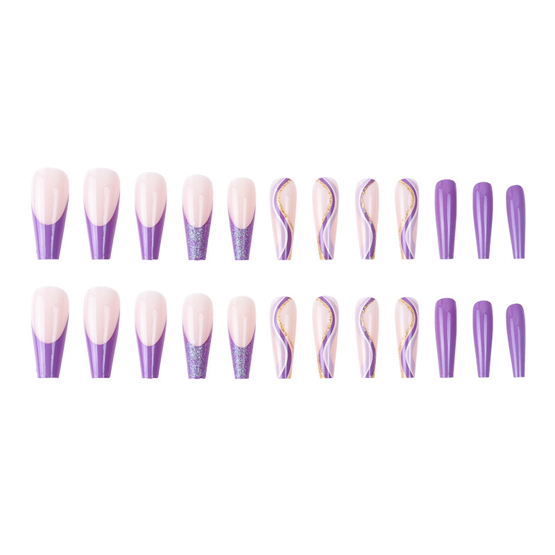 Manicura con purpurina morada, líneas geométricas francesas, parches de uñas brillantes Aurora - Pegamento CBLCY-34 está agotado y se enviará tan pronto como vuelva a estar disponible.