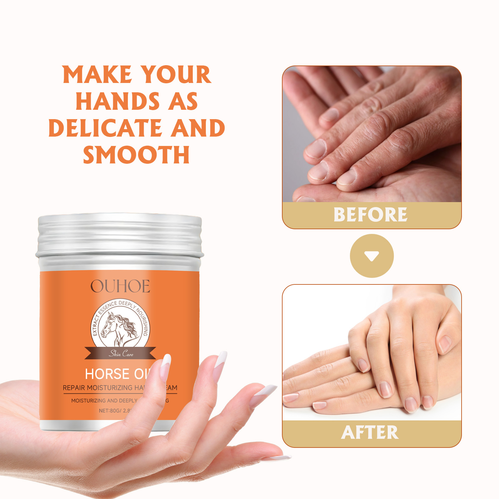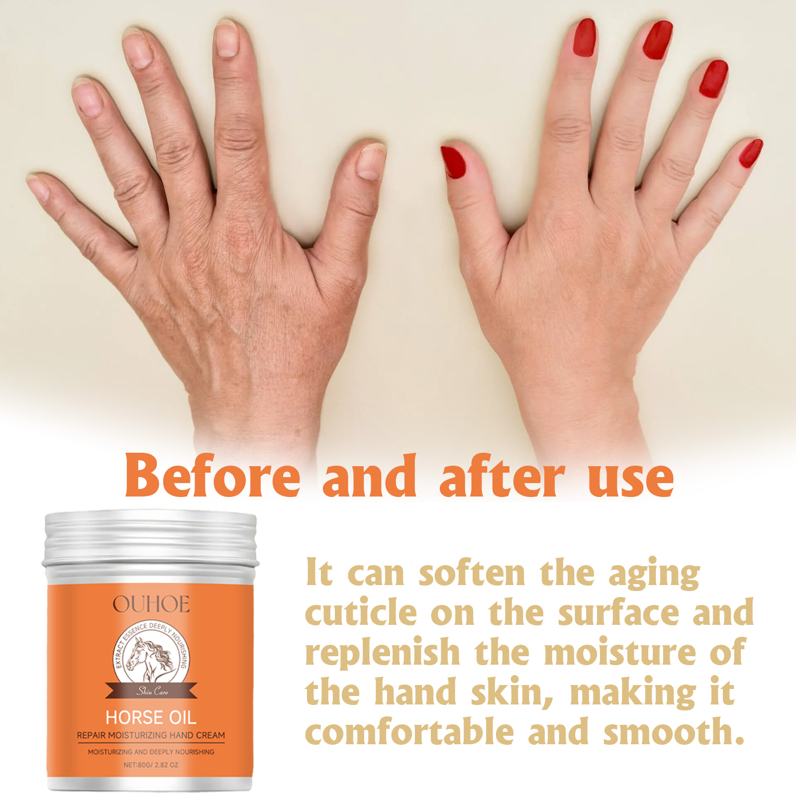 Nuestra Crema de Manos Reparadora Hidratante contiene grasa de caballo, extracto de fruto de Olea Europaea (oliva) y extracto de Butyrospermum Parkii (manteca de karité). Suaviza la superficie de las cutículas envejecidas, repone y retiene la hidratación al instante, dejando la piel suave y confortable. Su uso es muy sencillo: después de lavarse las manos, aplicar una cantidad adecuada de crema de manos y masajear el dorso hasta su completa absorción. Tras su uso, aclara e hidrata la piel de las manos, proporciona una hidratación duradera y reduce la sequedad, la aspereza y el picor.
