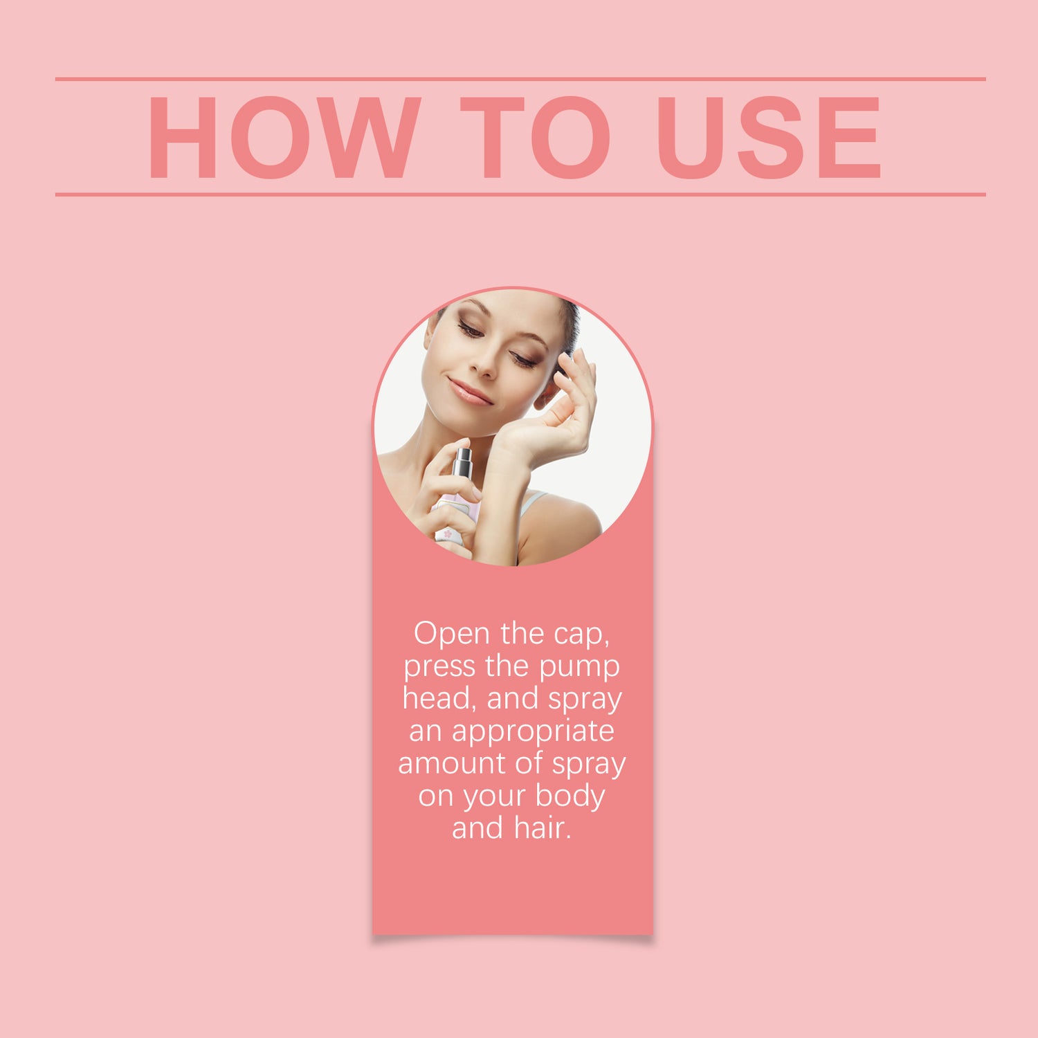 Nuestro perfume corporal y capilar en spray de rosas contiene aceite de ricino hidrogenado PEG-40 y glicerina. Su encantador aroma a rosas y sus ricas capas lo hacen romántico. Aporta luminosidad a la piel y al cabello. Ligero y no pegajoso, ideal para cualquier ocasión. Su aplicación es sencilla: abre el tapón, presiona el dosificador y aplica la cantidad adecuada en cuerpo y cabello. Su romántico aroma a rosas, atractivo y rico en capas, te dará un impulso instantáneo de carisma y confianza.