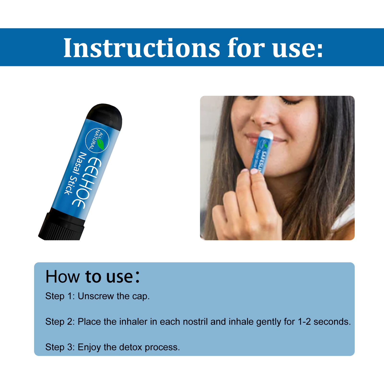 Nuestros tubos nasales delgados contienen aceite de eucalipto, borneol y extracto de pimienta negra. Son la solución clave para la desintoxicación, la eliminación de impurezas, la pérdida de peso rápida y la desintoxicación. Su uso es muy sencillo: primer paso: desenrosque la tapa del frasco. Paso 2: Coloque el inhalador en cada fosa nasal e inhale suavemente durante 1 o 2 segundos. Paso 3: Disfrute del proceso de desintoxicación. Los tubos nasales delgados eliminan toxinas del cuerpo, alivian enfermedades respiratorias, mejoran la circulación sanguínea y facilitan la respiración.