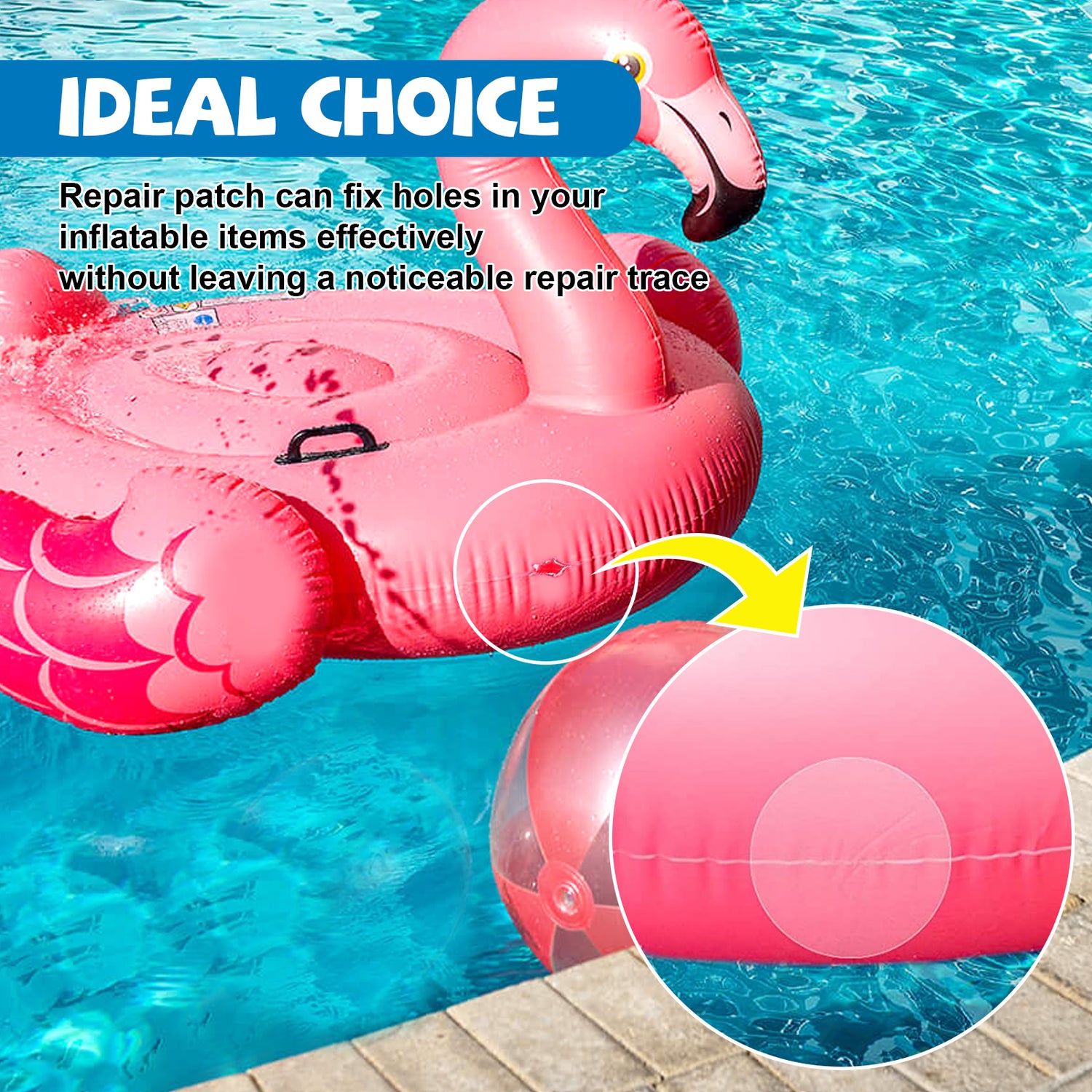 Nuestro parche para flotadores contiene TPU. Se puede aplicar a todo tipo de artículos inflables o impermeables: tiendas de campaña, flotadores, botes inflables, castillos inflables, juguetes inflables, etc. Su uso es sencillo: limpie y seque la superficie del flotador dañado, retire el parche de reparación 34, aplíquelo en la zona dañada y alíselo sin burbujas. Espere unos 30 minutos para que se adhiera firmemente. Además, puede reparar eficazmente las grietas en los artículos inflables, sin dejar marcas visibles.