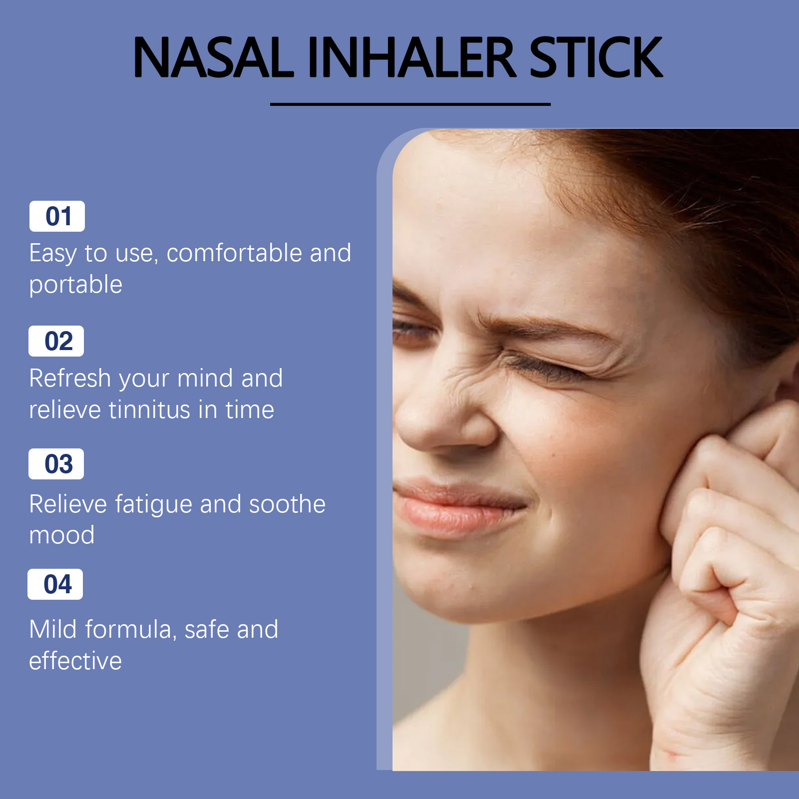 Nuestra barra nasal para el tinnitus contiene aceite de lavanda y extracto de manzanilla. Ayuda a aliviar la fatiga y a mejorar el estado mental. Su variedad de aceites esenciales proporciona una experiencia relajante completa. Su aplicación es sencilla: desenrosque la tapa, mantenga el producto en posición vertical, colóquelo frente a la fosa nasal, respire profundamente y repita el proceso en la otra fosa nasal. Su fórmula suave es segura y eficaz.