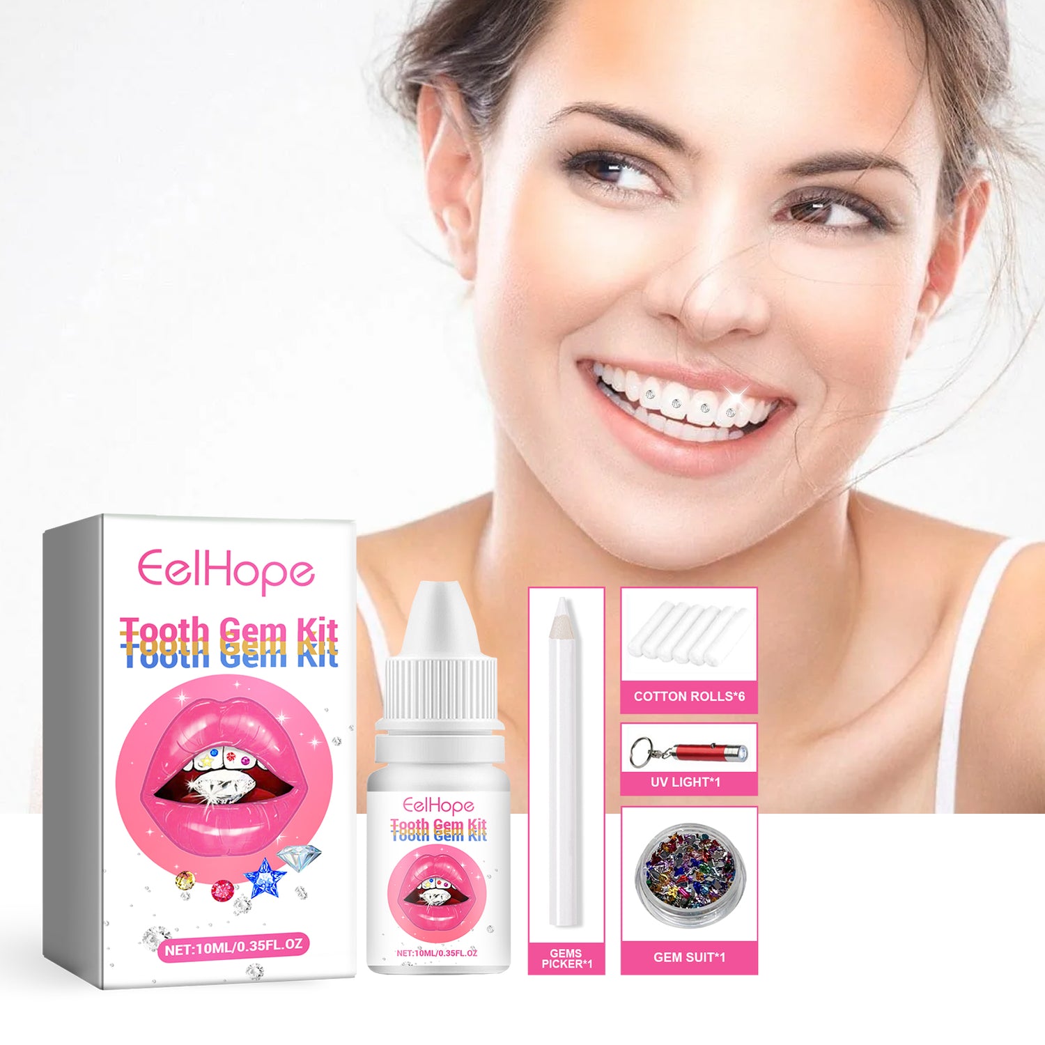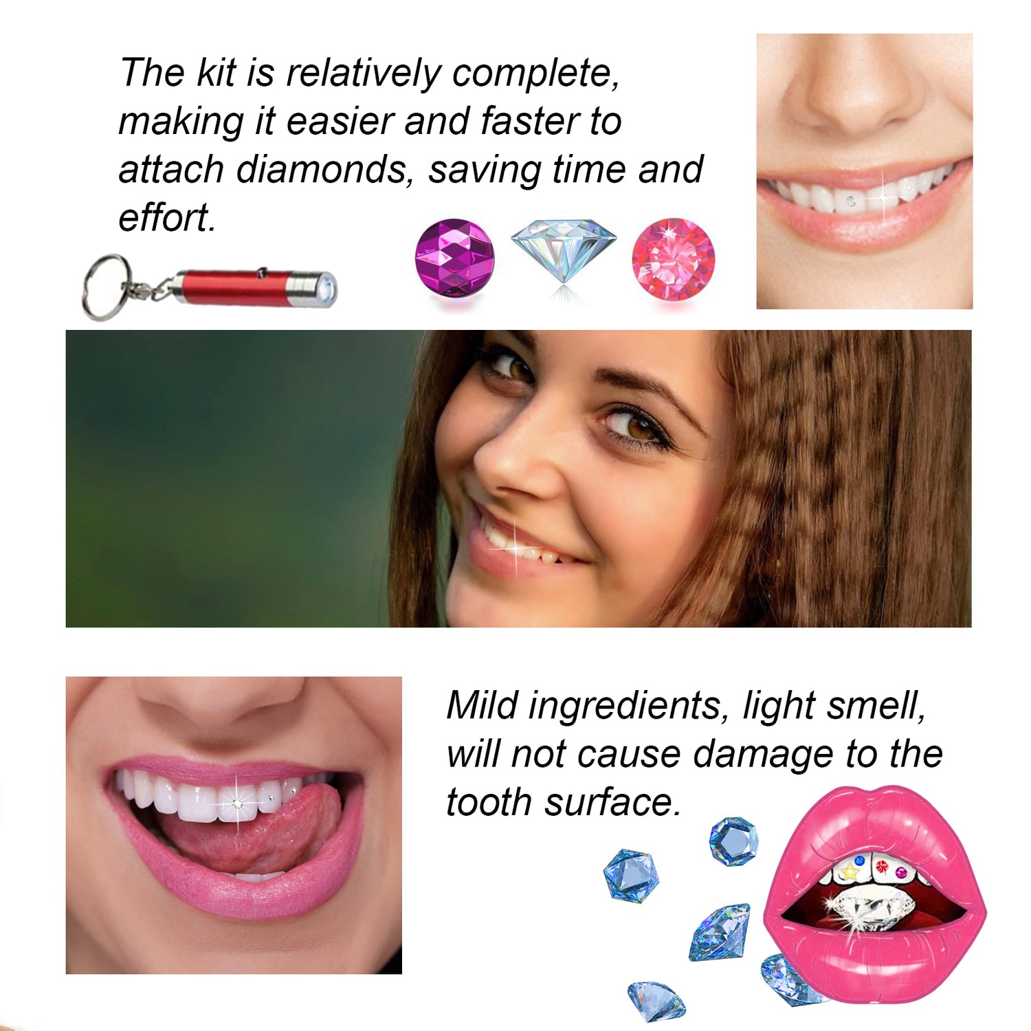 Nuestro kit de gemas dentales DIY incluye pegamento UV. Te hará lucir una sonrisa radiante, garantizando que el diamante adherido a la superficie dental sea resistente a la caída y con seguridad. Su uso es muy sencillo: primero limpia los dientes, luego seca la superficie con un hisopo de algodón, aplica pegamento en la superficie donde se va a colocar el diamante, pega el diamante con un bolígrafo, pégalo en la superficie dental, ilumina con una lámpara ultravioleta durante 60 segundos y espera a que se seque. Después de usarlo, tu sonrisa lucirá más atractiva y radiante.