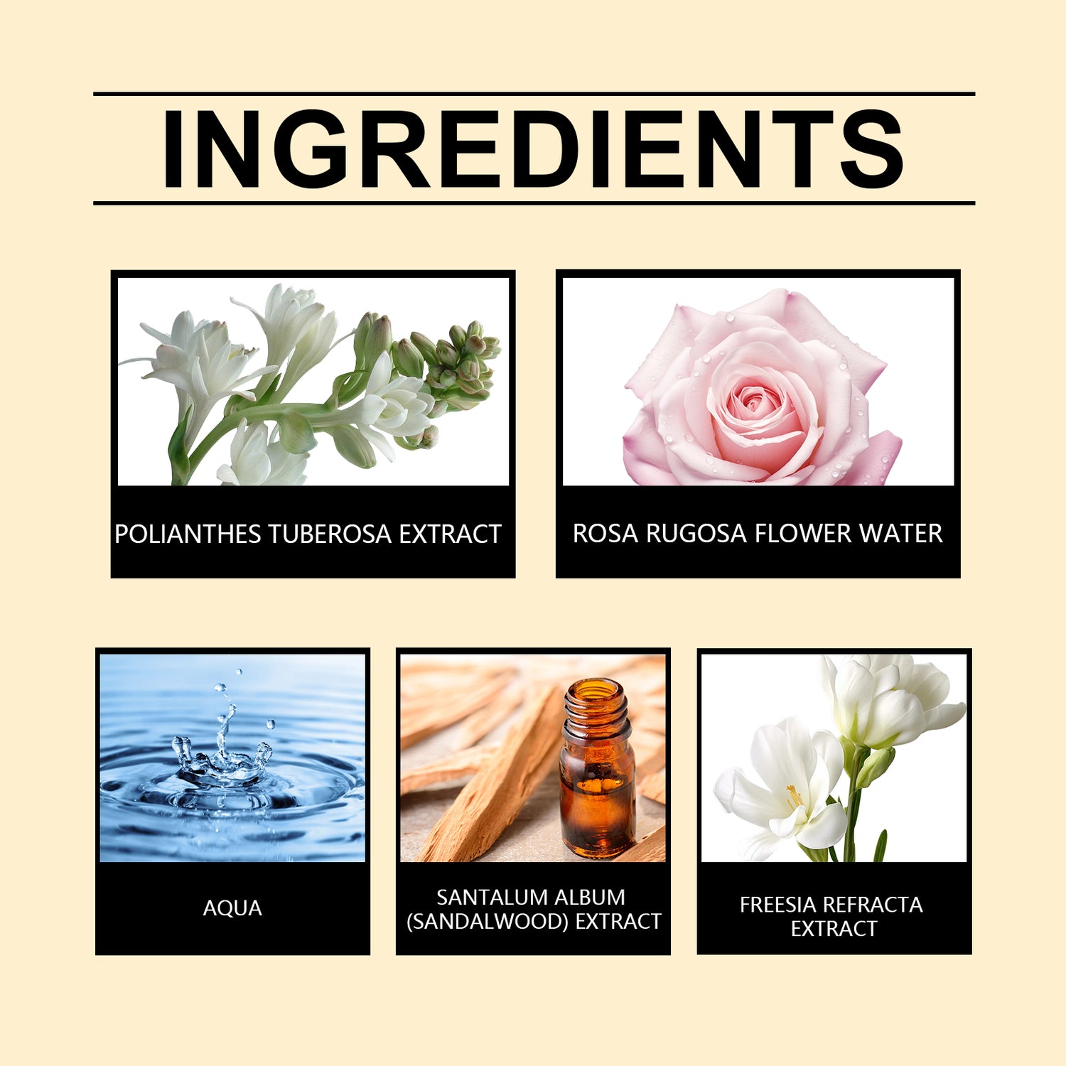 Nuestro Eau de Toilette Tuberose Charm contiene extracto de nardo, agua de rosas y extracto de sándalo. Desprende una rica fragancia floral y crea una atmósfera misteriosa y elegante. Ofrece notas florales frescas y dulces que añaden matices de fragancia. Añade una profunda nota amaderada que prolonga el aroma. Su modo de uso es muy sencillo: rocíe suavemente el perfume en la muñeca, el cuello, detrás de las orejas y otros puntos de pulso, aplicando una o dos veces cada vez para lograr una distribución óptima del perfume. Ya sea para el día a día o para ocasiones especiales, despliega un encanto único. La combinación de aromas de naranja y rosa crea una atmósfera elegante y encantadora.
