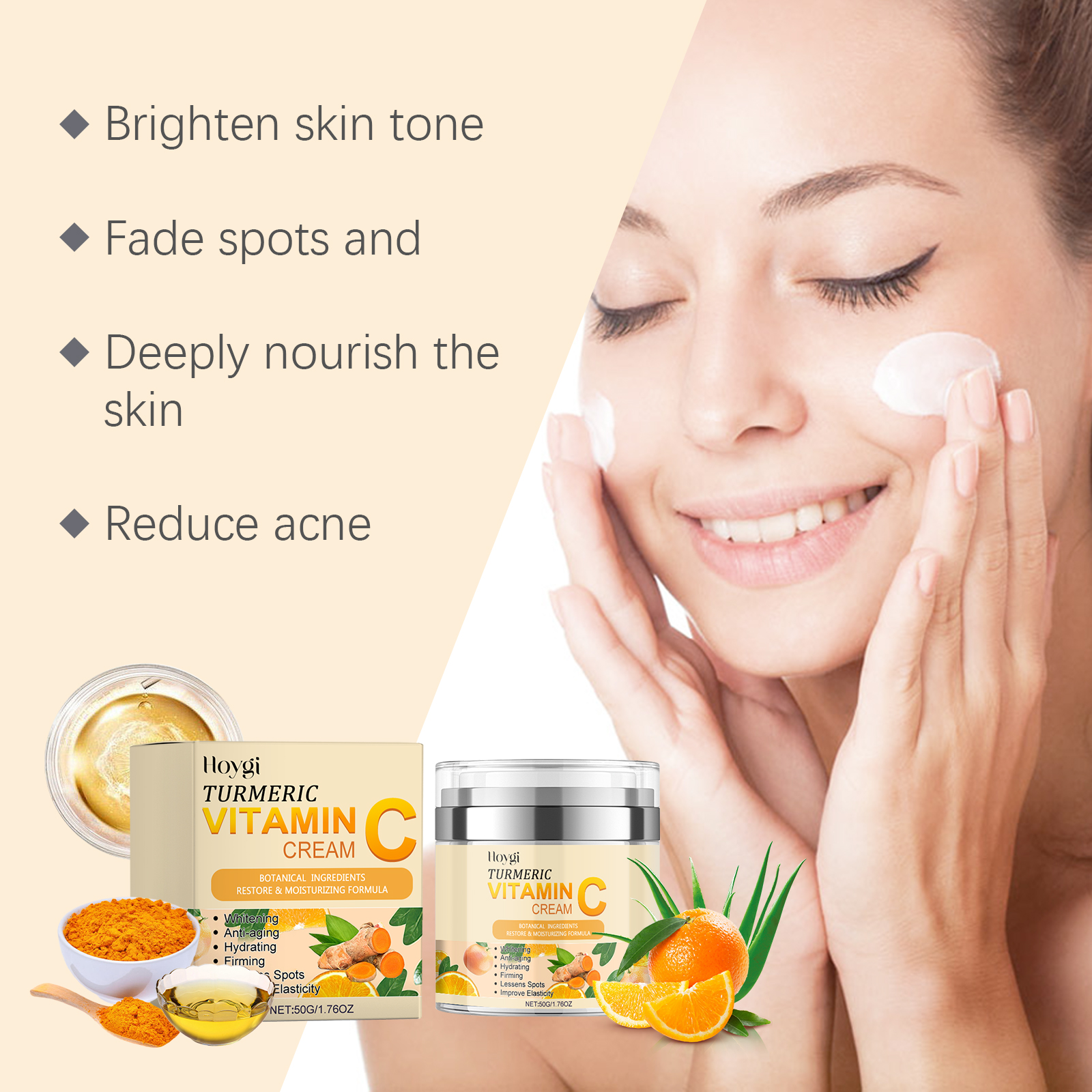 Crema iluminadora con cúrcuma y vitamina C, hidratante, unifica el tono de la piel y aclara las marcas del acné.