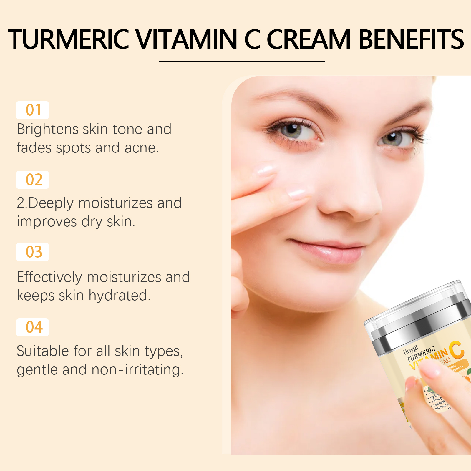 Nuestra crema iluminadora de cúrcuma y vitamina C contiene aceite de jojoba y ácido hialurónico. Hidrata profundamente y mejora la piel seca. Su aplicación es muy sencilla: limpia y acondiciona la piel del rostro y aplica la cantidad adecuada de crema uniformemente. Masajea suavemente con las yemas de los dedos hasta que se absorba por completo. Además, fortalece la barrera cutánea, previene la pérdida de agua y mantiene el equilibrio hídrico y graso.