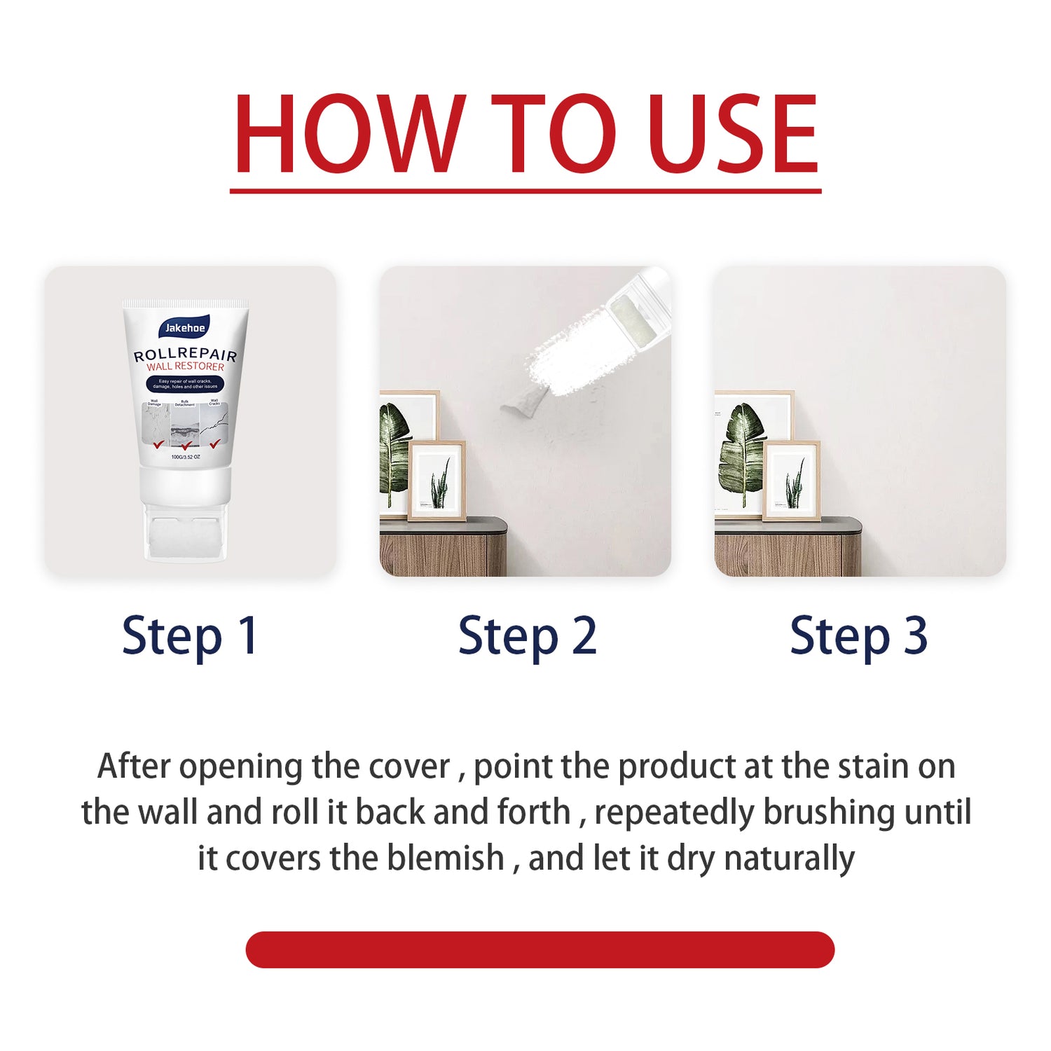 Nuestra pasta reparadora de paredes contiene carbonato de calcio y óxido de calcio. Es impermeable, resistente a las grietas, a los álcalis y al moho, de secado rápido, respetuosa con el medio ambiente y se adhiere firmemente a la pared después de la reparación, dejándola como nueva. Su método de uso es muy sencillo: tras abrir la tapa, se aplica el producto sobre la mancha, pasando el rodillo de un lado a otro y cepillando repetidamente hasta que la mancha quede cubierta y se seque de forma natural. El yeso repara paredes eficazmente sin dejar rastro.