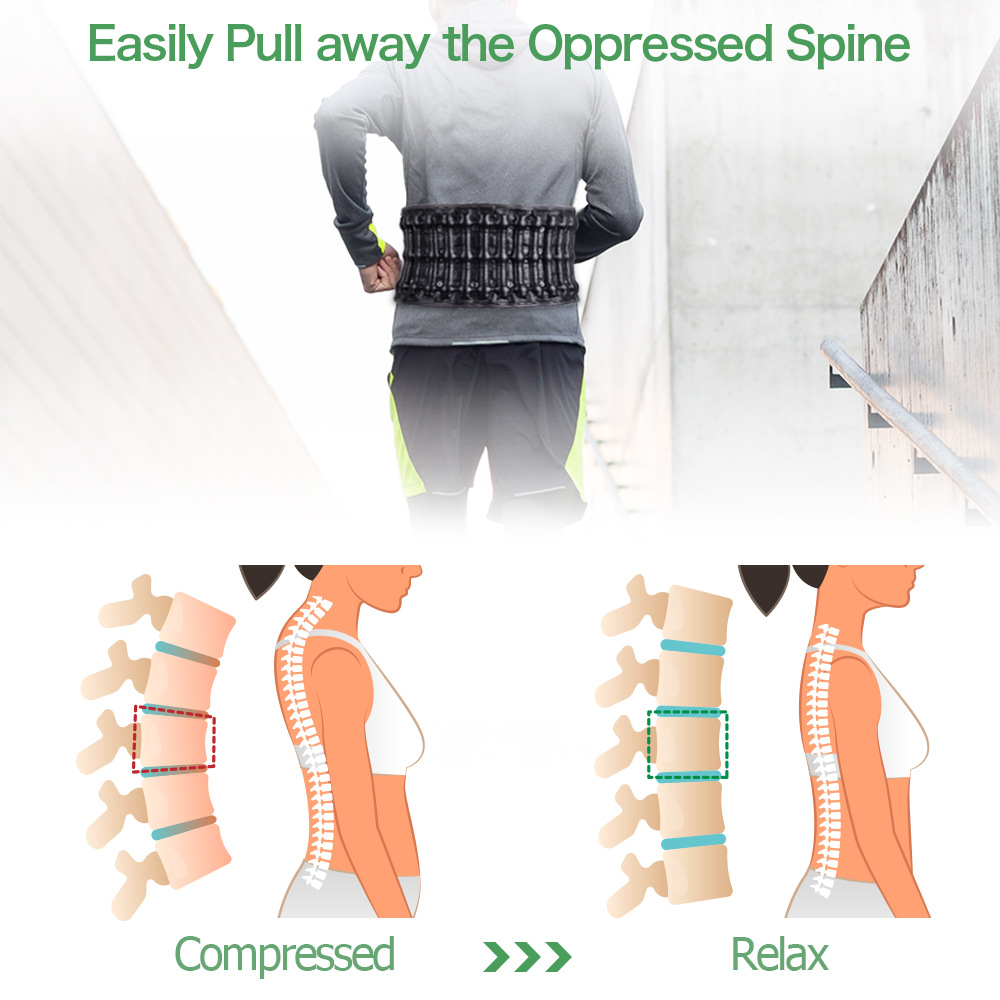 4. Doble función de protección lumbar y de cintura: al mismo tiempo que se aplica el tratamiento de tracción, el cinturón de soporte continuo reduce la presión sobre la columna lumbar (la presión sobre la columna lumbar es menor, lo que reduce la posibilidad de espondilosis lumbar, y el ancho del cinturón puede evitar que la columna lumbar se incline hacia adelante). Para acciones desfavorables para la columna lumbar, como inclinarse hacia los lados o inclinarse hacia adelante, el uso de "Waist Doctor" favorece la recuperación de la alineación fisiológica normal (curva) de la columna lumbar y contribuye a la prevención de la espondilosis lumbar.