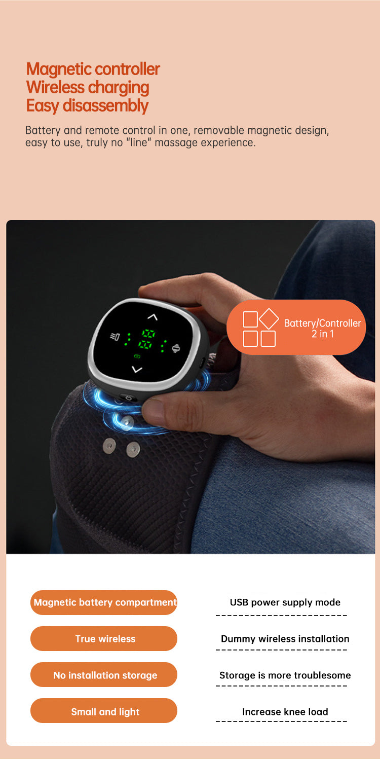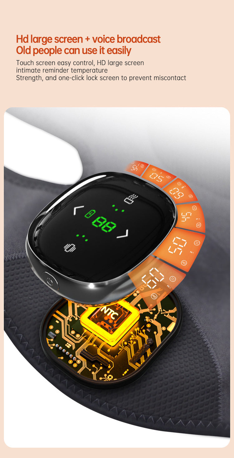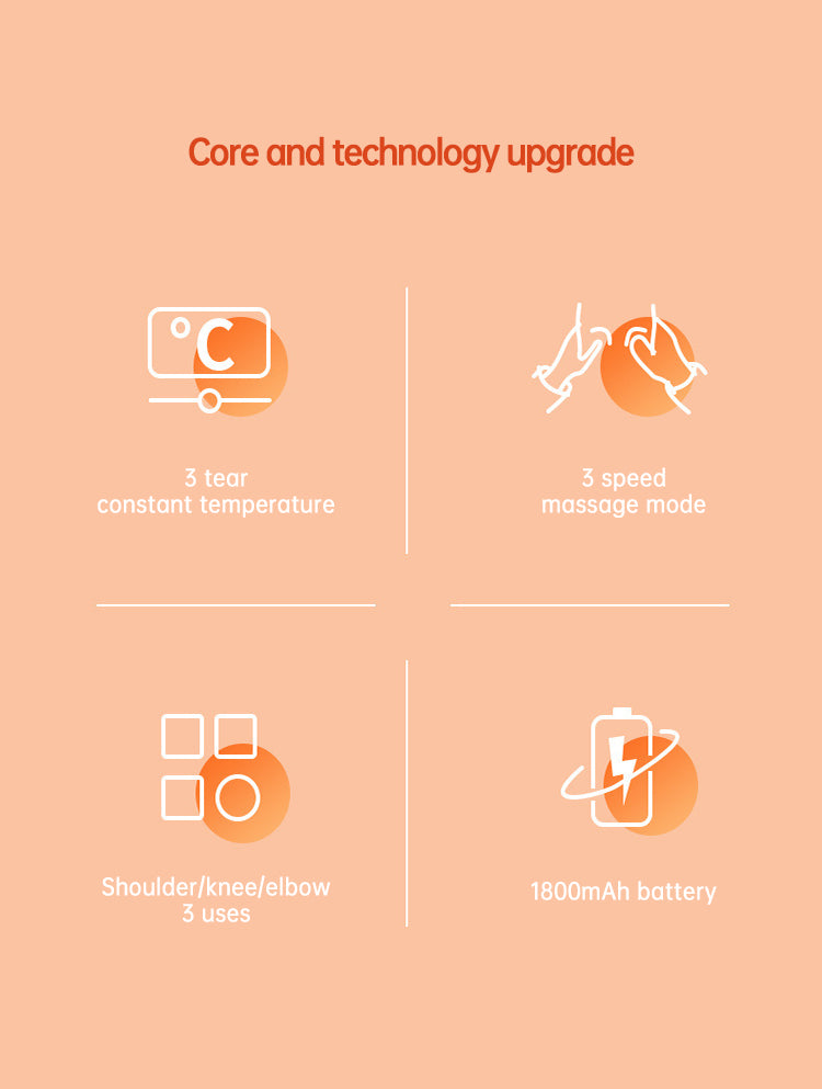 Puntos de venta del producto: compresa caliente vibratoria, reproducción de voz, sincronización inteligente, multiusos para hombros, rodillas y codos.
