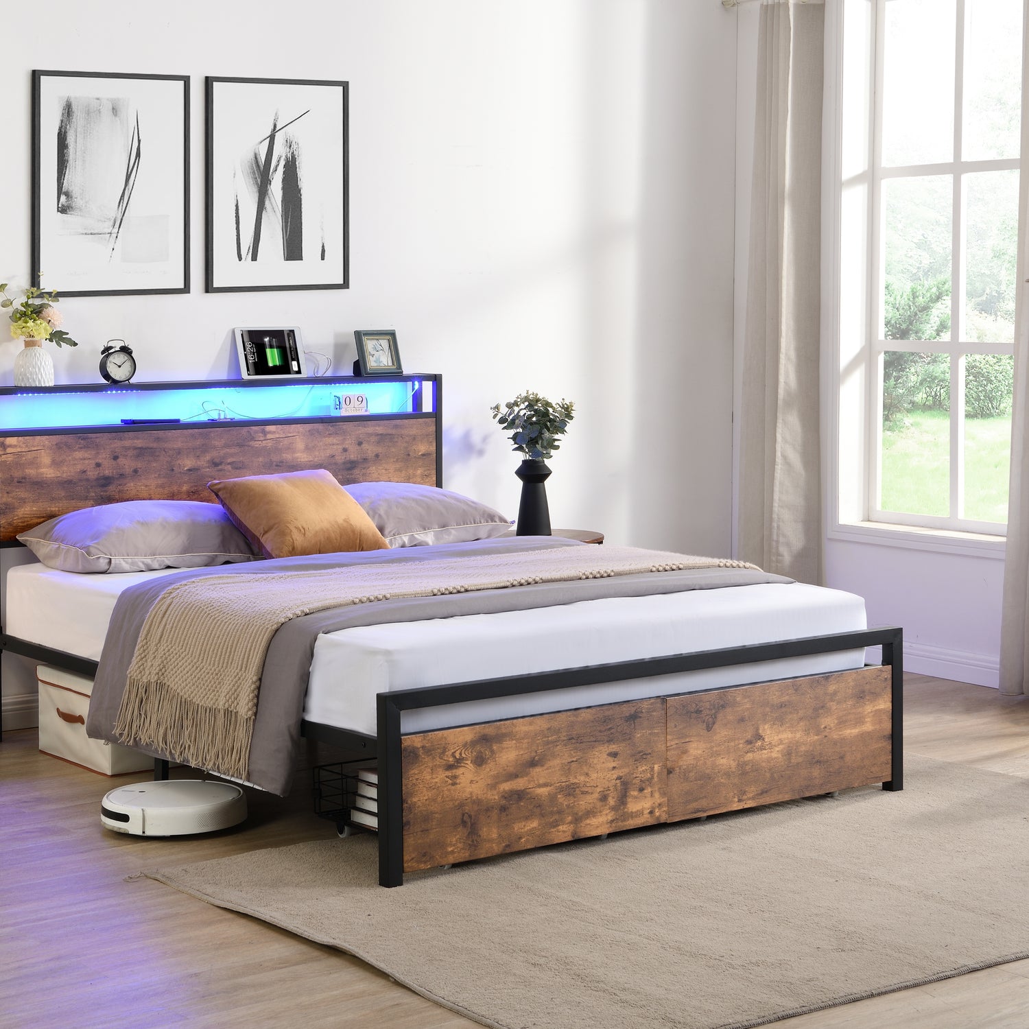 Large bed frame with storage headboard and 2 drawers, LED light bed, charging station, metal platform bed - V.I.P Digital Presence