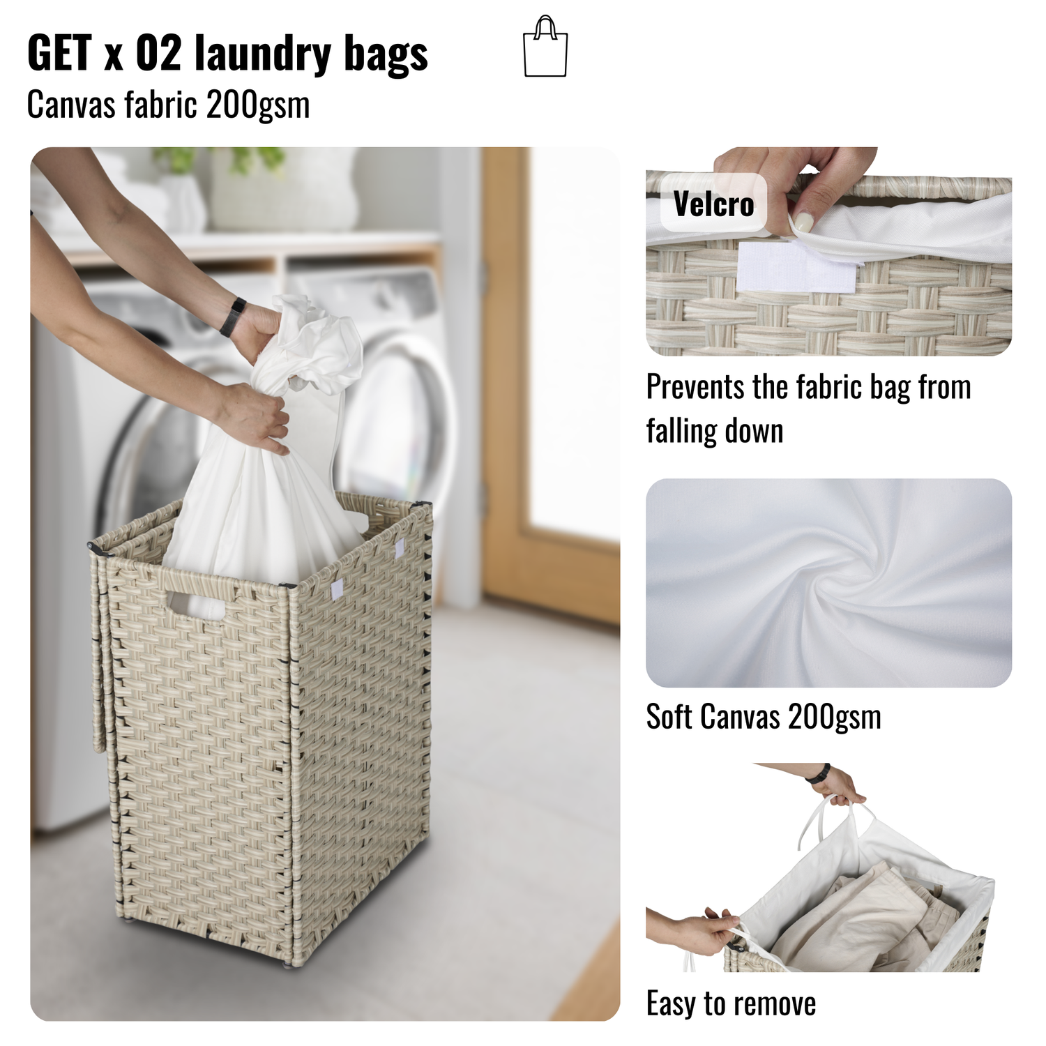 MATERIALES DE PRIMERA CALIDAD: El organizador de ropa sucia está diseñado para ahorrar espacio cuando no se usa. Fabricado en mimbre de ratán plástico ecológico con patrones naturales únicos, su resistente estructura de acero con recubrimiento en polvo incluye dos bolsas de ropa sucia lavables y extraíbles de lona suave de 200 g/m². Dispone de una bolsa de un compartimento y otra de dos para clasificar la ropa fácilmente.