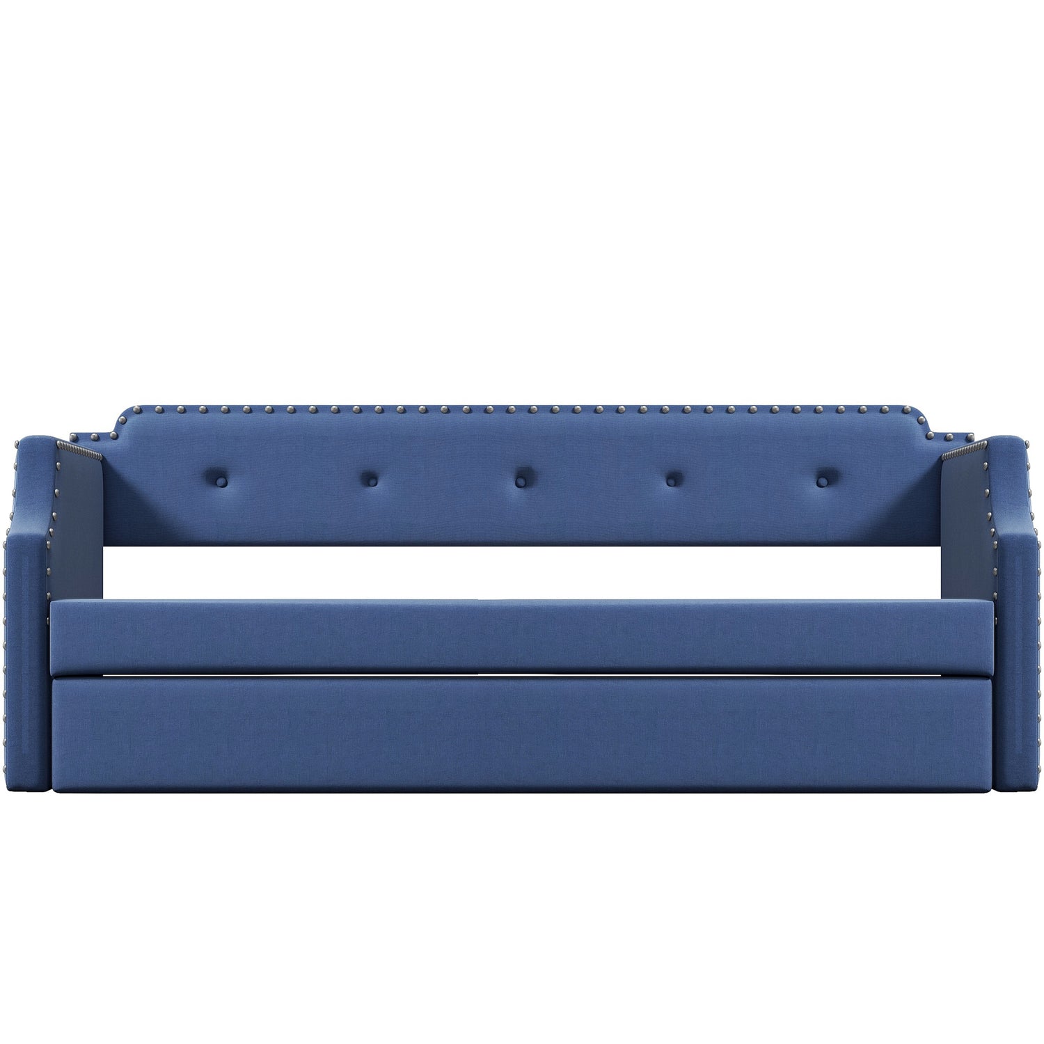 Sofá cama tapizado con cama nido y listones de madera, con estructura tapizada, tamaño individual, color azul