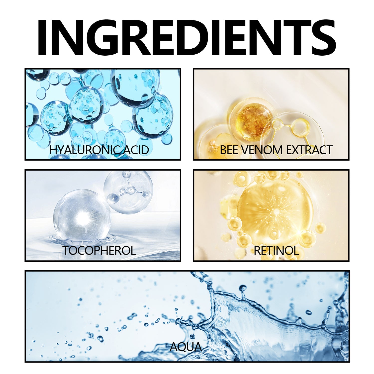 Our Bee Venom Night Gel contains Bee Venom Extract, Hyaluronic Acid, Tocopherol. It can help repair dry and rough skin, make your skin soft and smooth, improve sensitive and damaged skin, reduce skin discomfort, speed up the skin repair process, this product has a light texture, can be quickly absorbed by the skin, keep skin fresh and comfortable. Its application method is very simple: clean facial skin, keep dry, apply appropriate amount of this product evenly on facial skin, gently massage until the water is completely absorbed. It can deeply moisturize the skin, replenish water to the skin, and keep the face moisturized.