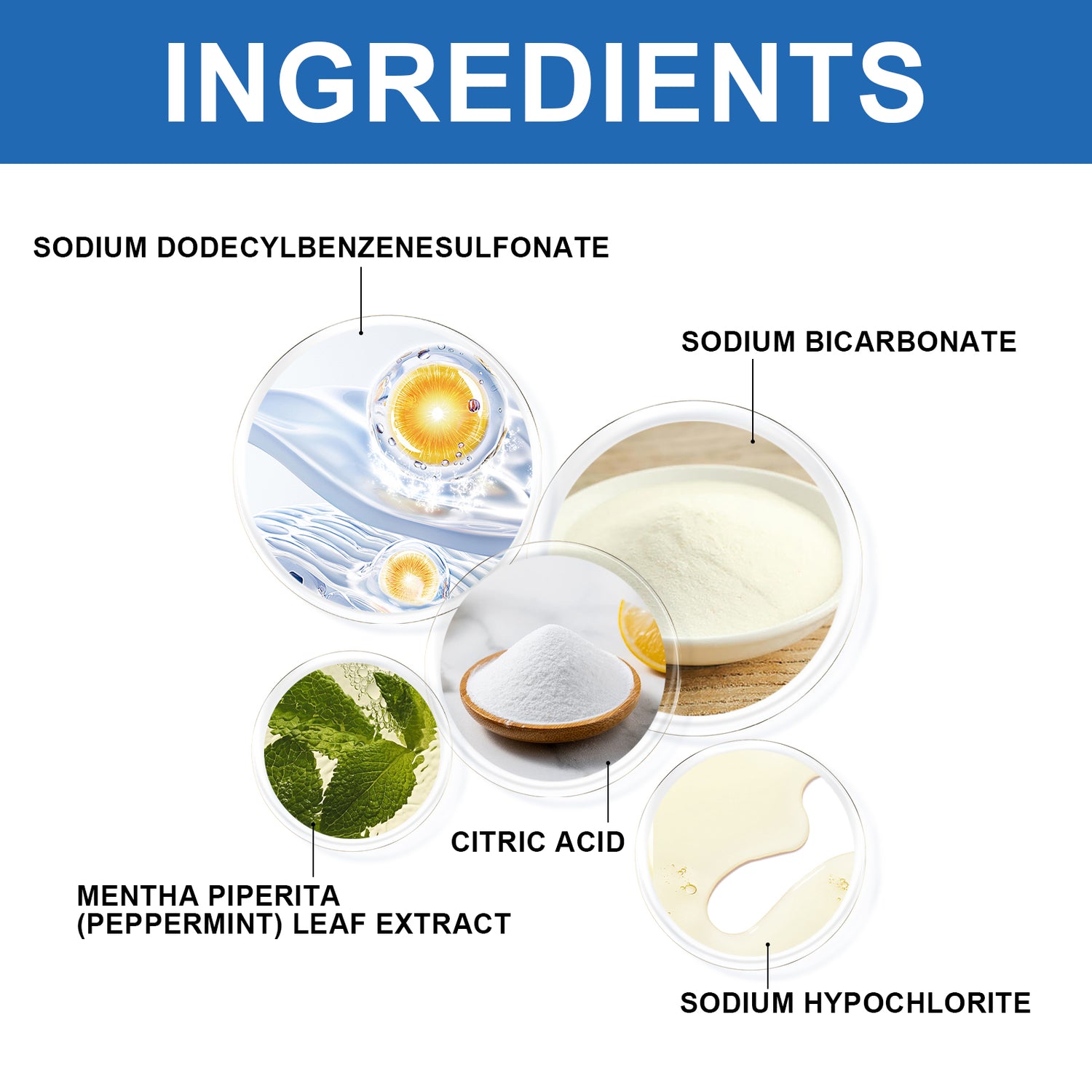 Our washing machine cleaning Effervescent tablets contain crosslinked carboxymethyl cellulose and peppermint leaf extract. It can be strongly formulated and easily breaks down all kinds of stains. Its use method is very simple: pour out the water in the washing machine, without disassembling the washing machine, add the washing machine cleaning agent to start cleaning, after the washing process is completed, you can clean the washing machine sink. And can efficiently decompose grease without leaving any residue, improve the cleaning efficiency of the washing machine.