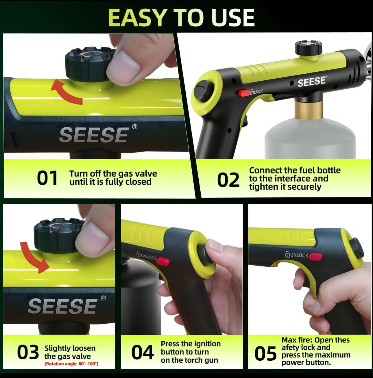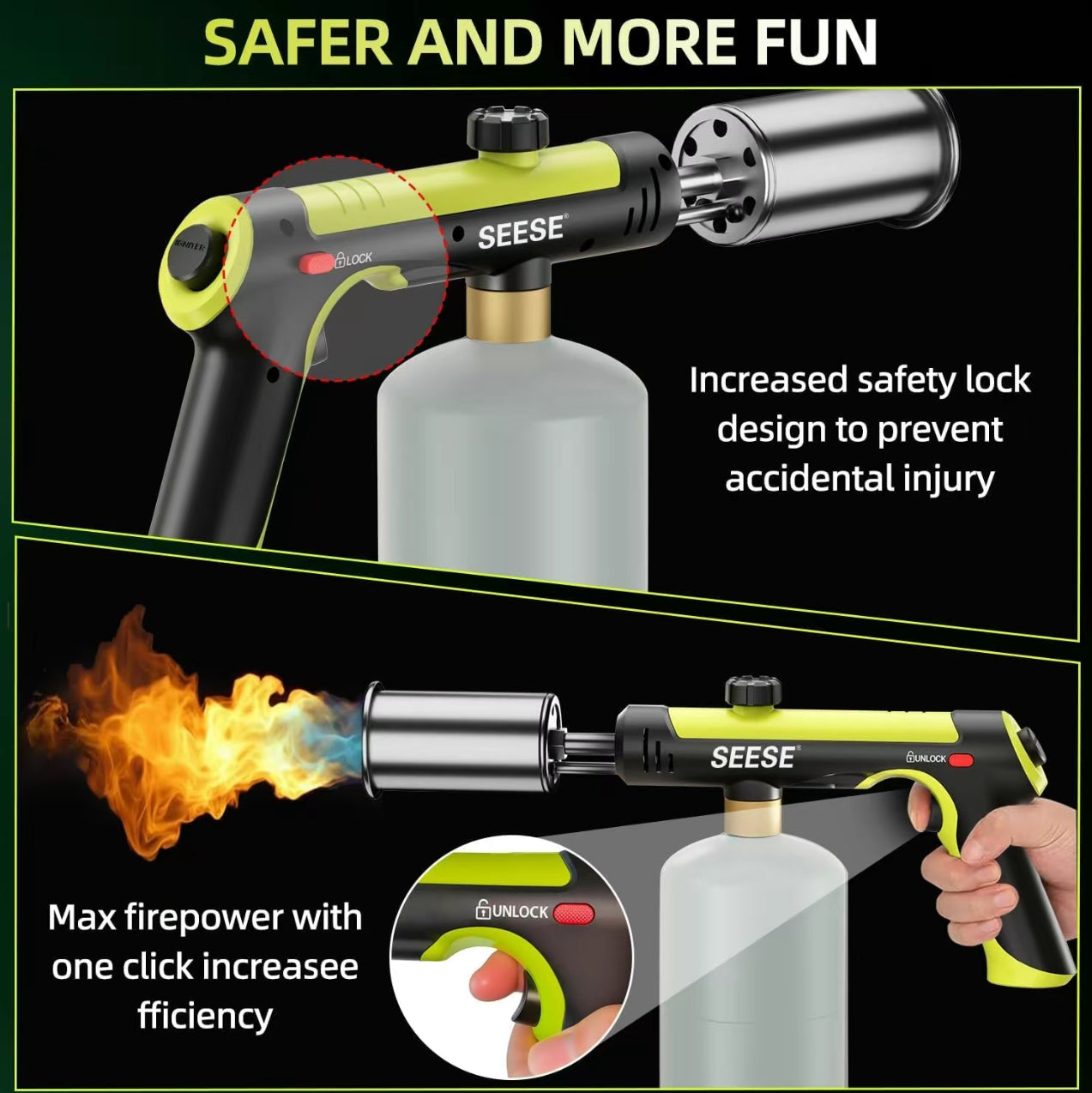 Unleash precision power with the FlameForge Torch, your all-in-one solution for cooking, soldering, camping, and beyond. Designed with durable brass and ABS materials, this propane-powered torch reaches searing temperatures up to 3272°F (1800°C) — perfect for sous vide, BBQ, lighting charcoal, or metal crafting. Built with safety and performance in mind, it features Triple Safety Assurance with a Safety Lock, One-Touch Max Fire Button, and heat-sensitive coating to ensure worry-free operation.