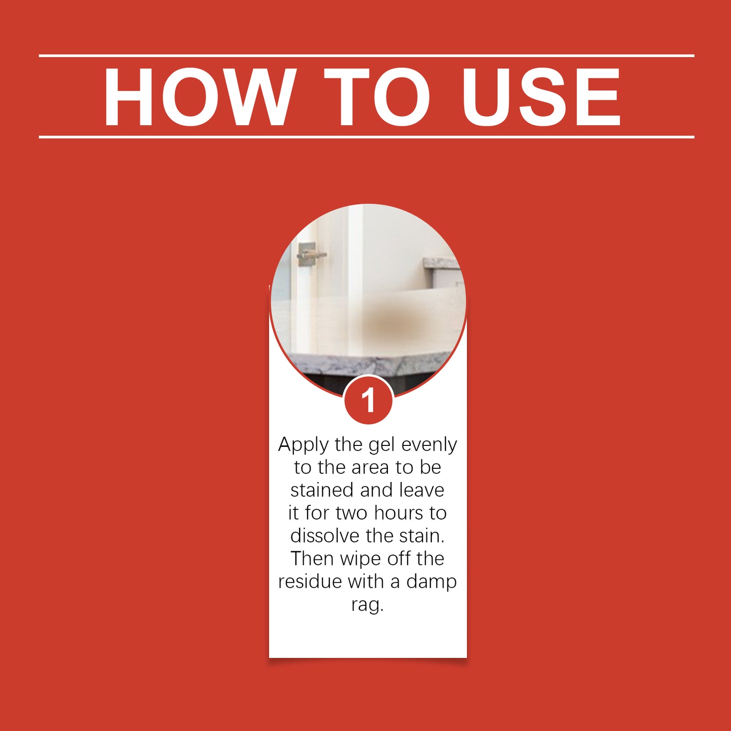 Our decontamination gel contains disodium EDTA, sodium bicarbonate, lauryl ether 7. It can be highly permeable, allowing the solution to penetrate deeply and quickly break down potentially stubborn stains. Its application method is simple: apply the gel evenly to the stained area and let it sit for two hours to dissolve the stain. Then wipe off the residue with a damp rag. It solves stubborn surface stains from the root, ensuring effective cleaning without leaving any residue and stains, providing you with long-term cleaning space!