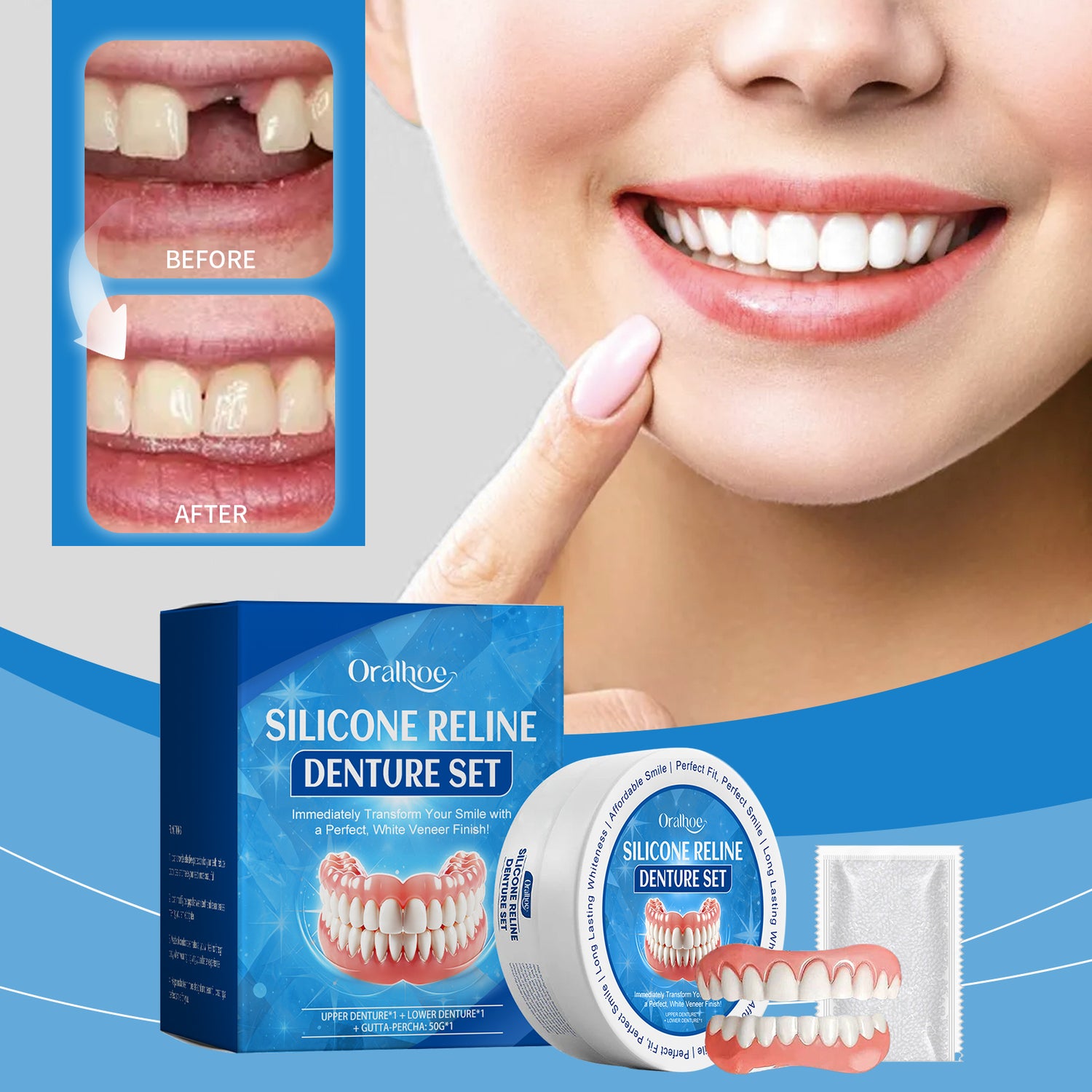 Kit de dentaduras postizas cosméticas para mejorar la comodidad de la sonrisa. Kit de cuidado de grietas dentales cosméticas. - título predeterminado está agotado y se enviará tan pronto como vuelva a estar disponible.