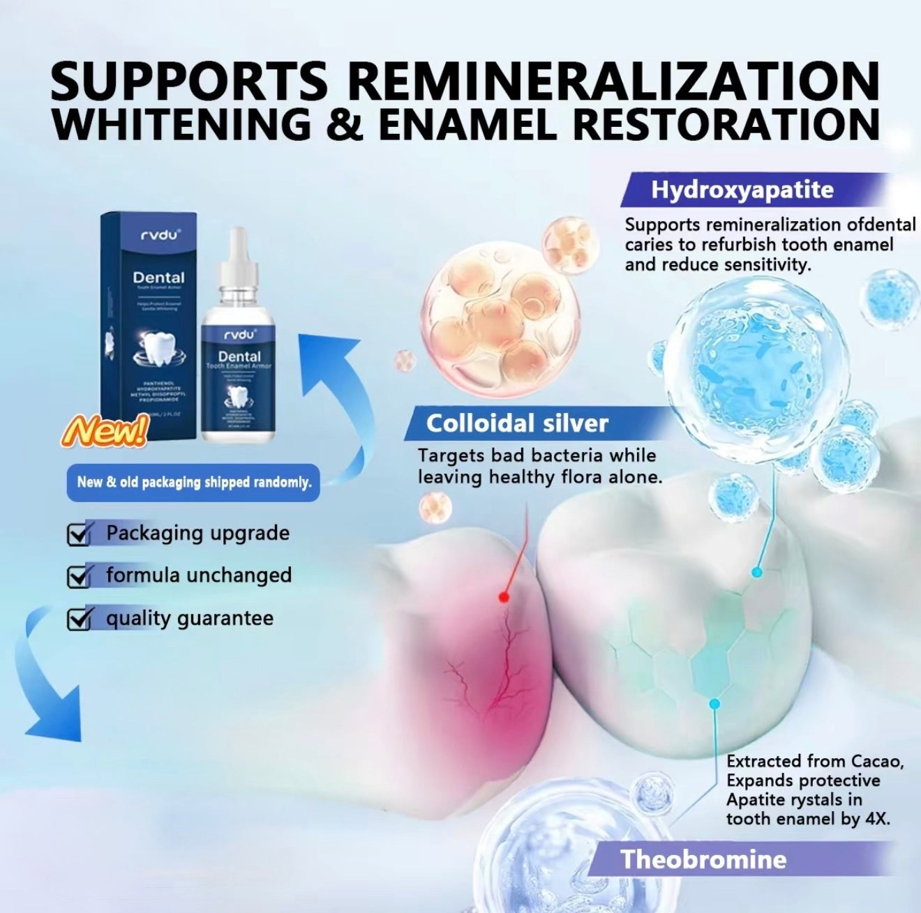 Formulated with enamel-identical hydroxyapatite, these drops help repair microscopic enamel damage, fill surface imperfections, and reinforce tooth structure. Perfect for those with sensitive teeth or weakened enamel.