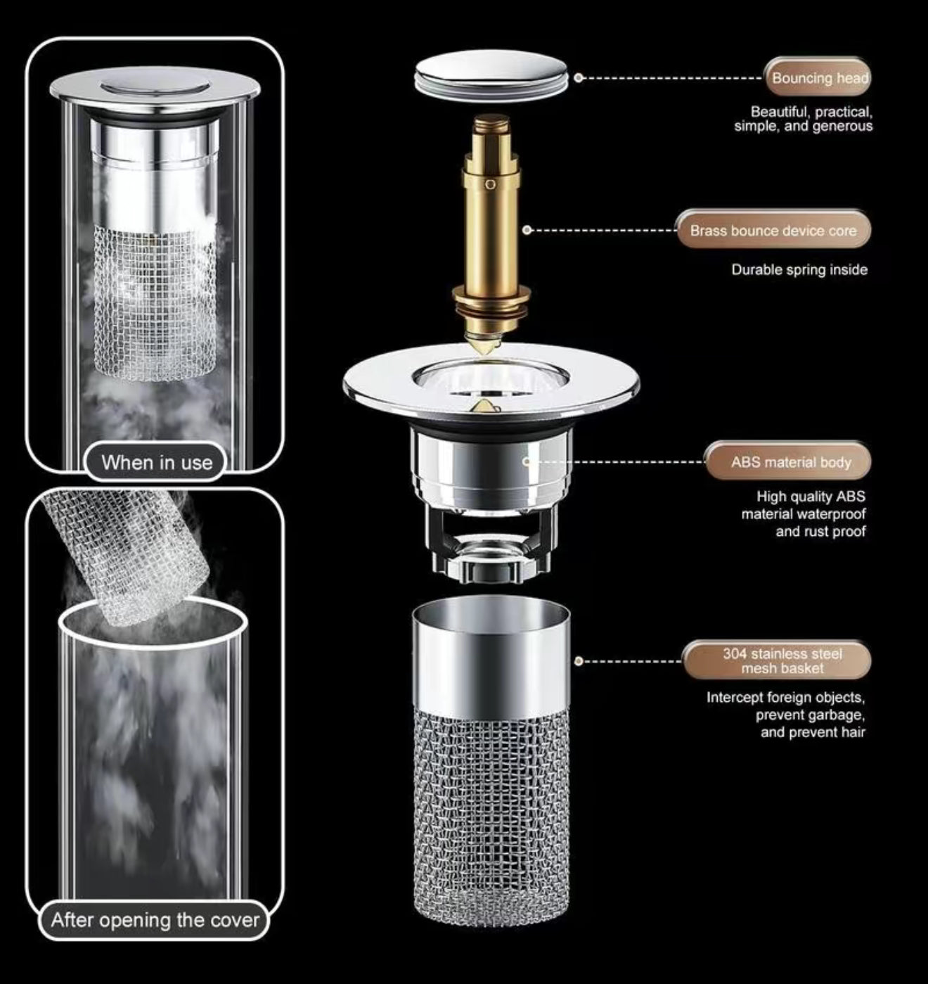 Universal Pop‑Up Filter Basket — Fits most sink drains so you can just pop it in and forget about clogs.