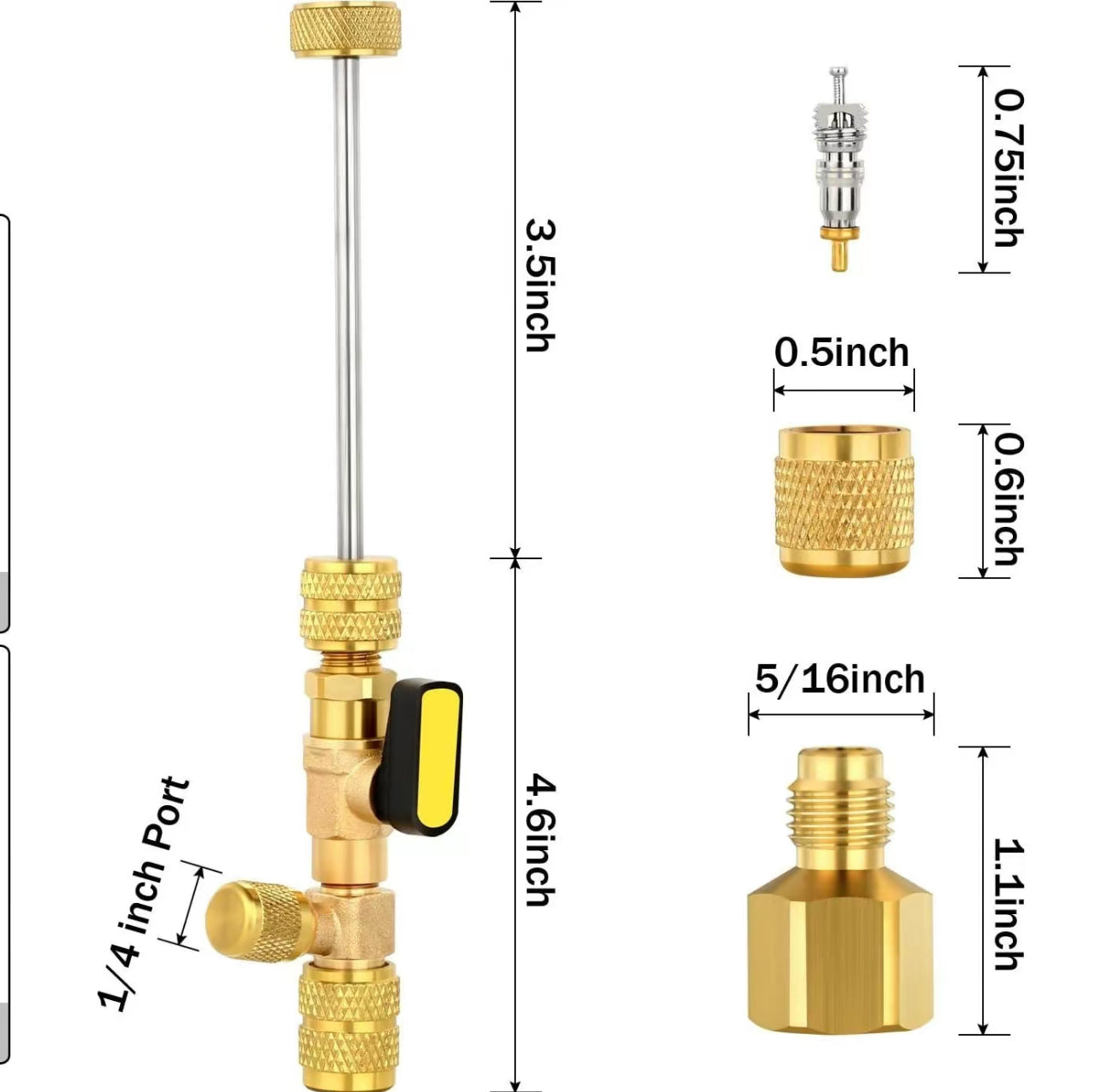 The dual-size design (SAE 1/4” & 5/16” ports) makes it compatible with popular refrigerants like R22, R12, R407, R410, R404, R32, and more. (Note: Not compatible with automotive A/C systems.) -
