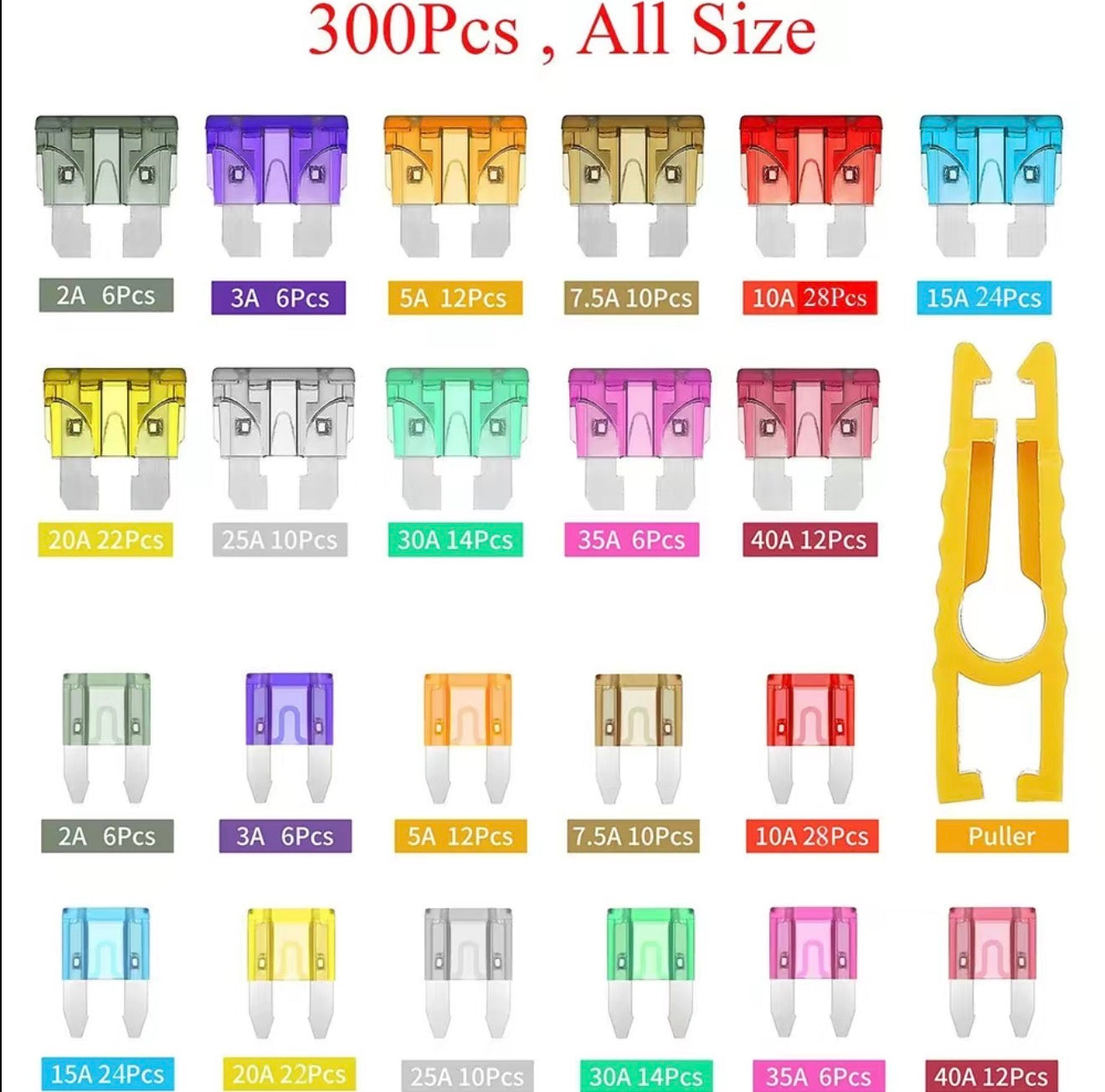 This kit includes 300 pieces total—150 mini blade fuses and 150 standard auto fuses, along with a fuse puller for quick and safe removal. It covers all commonly used amperages: 2A, 3A, 5A, 7.5A, 10A, 15A, 20A, 25A, 30A, 35A, and 40A, making it suitable for a wide variety of automotive and recreational vehicles.
